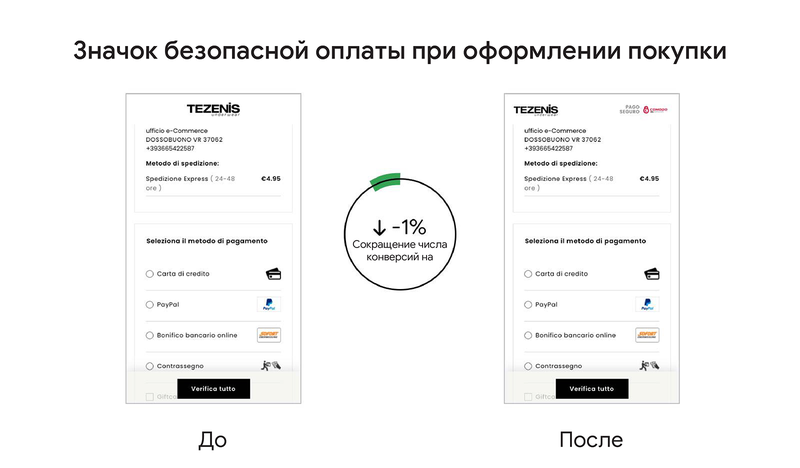 Оформление заказа и оплата — самая деликатная часть процесса. Исследование Statista показало: в 82% случаев пользователи отказываются от покупки именно на этом этапе. Кого-то не устраивает стоимость доставки, а кто-то добавляет товары в корзину, чтобы сравнить цены. В исследовании за 2015 год выяснилось: пользователи отказываются от покупки и потому, что сомневаются в безопасности транзакции. Но данные того же исследования за 2019 год говорят о том, что эта причина перестала быть главной. На сайте Tezenis мы попробовали разместить в корзине значок безопасной оплаты — количество конверсий уменьшилось. Это говорит о том, что каждое предположение нужно проверять, а запросы посетителей сайта меняются со временем.