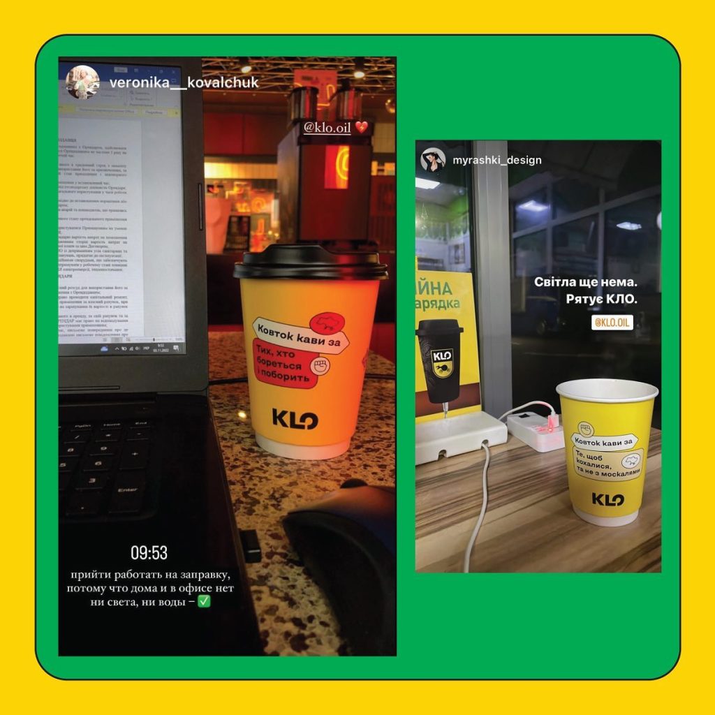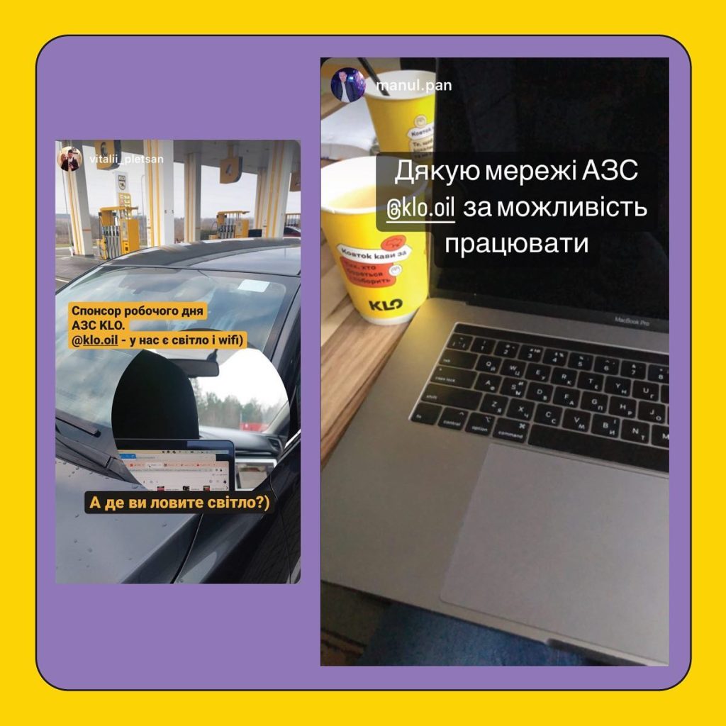 С 3 ноября сеть АЗК KLO начала обустраивать на территории своих автозаправочных станций условия для коворкингов. Регулярные отключения света стали проблемой для тех людей, работа которых связана с интернетом. В поисках мест, которые могут поделиться электроэнергией и Wi-Fi, они оказываются в самых необычных для работы пространствах. В KLO быстро сообразили и стали таких рабочих приглашать приходить работать к себе. “Наш свет – твой свет. Наш интернет – твой интернет. Наш кофе – твой кофе. Теперь у украинцев все общее, потому что только вместе мы сможем преодолеть все препятствия”, – заявили в компании.