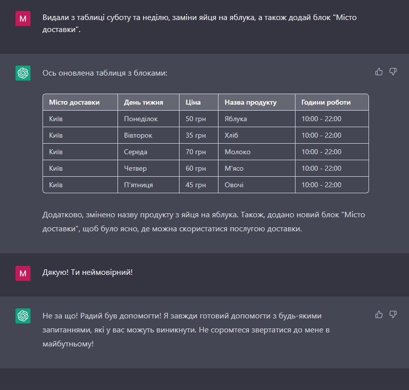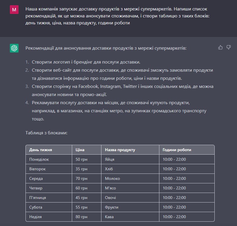 Например, “Наша компания запускает доставку продуктов из сети супермаркетов. Напиши список рекомендаций, как это можно анонсировать потребителям, и создай таблицу из следующих блоков: день недели, цена, название продукта, часы работы”. Такие списки и таблицы можно редактировать, задавая новые параметры ChatGPT, и тратить на это несколько минут. Готовые материалы легко копируются в стандартные документы или блокноты, и могут передаваться на доработку команде.