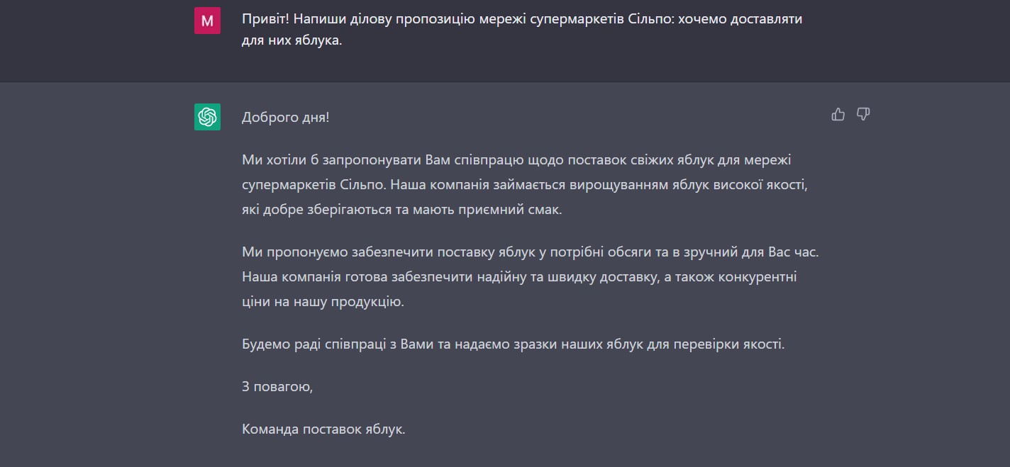 Или вот так может звучать предложение в Сільпо от компании, которая хотела бы стать поставщиком яблок в супермаркеты сети. Некоторая доработка запроса, добавление деталей и письмо готово намного быстрее, чем если бы его писал только человек.