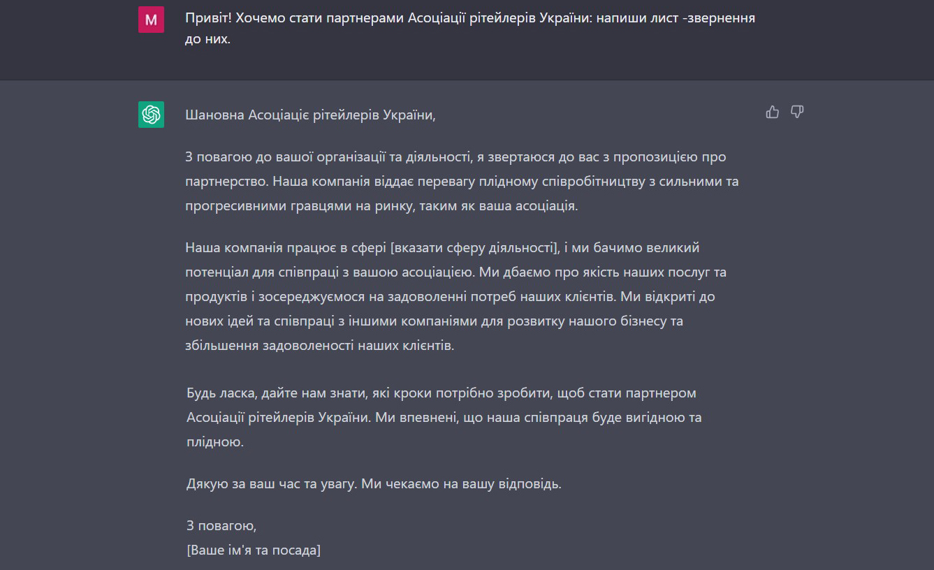 Умело пишет ChatGPT также деловые письма, что способно экономить время специалисту во время формирования запроса, например, в Ассоциацию ритейлеров Украины о возможности партнерства.