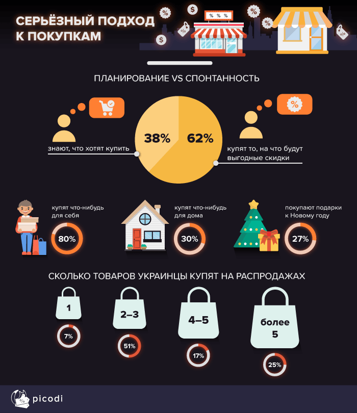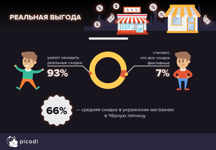 Многочисленные статьи в интернете разоблачают магазинные уловки, призванные привлечь внимание покупателей. Однако опытного шопоголика легко не проведешь — 93% опрошенных признались, что умеют из всего многообразия промо-акций находить реальные скидки, и только 7% пожаловались на то, что, по их мнению, все скидки в Black Friday фиктивные и не заслуживают внимания. По внутренним данным Picodi в прошлые годы средняя скидка в украинских магазинах в “Черную пятницу” составляла 66% — цифра весьма реалистичная.