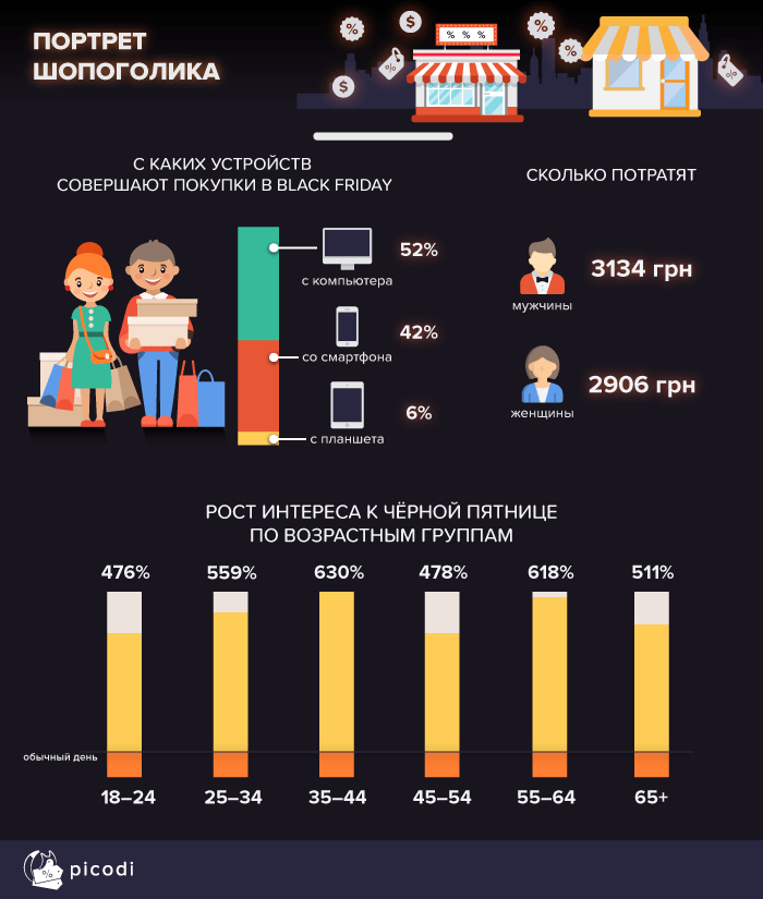В среднем мужчины собираются потратить больше денег на распродаже, чем женщины: 3134 против 2906 грн. Интересны данные о росте активности разных возрастных групп в ноябрьских распродажах. Отлично это иллюстрирует статистика прошлого года. Самой активной оказалась аудитория в возрасте от 35 до 44 лет — ее на 630% больше, чем в обычную пятницу. Отличились также покупатели в возрасте от 55 до 64 лет — их на распродажах оказывается на 618% больше, чем обычно.