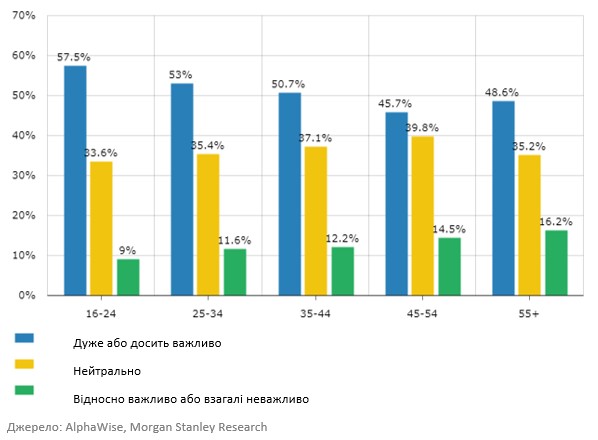Молодые потребители делают больший упор на этике во время покупок, при этом 58% лиц в возрасте от 16 до 24 лет считают, что этика является очень важным или достаточно важным фактором по сравнению с 49% – 55 лет и старше. Кроме того, процент респондентов, рассматривающих этические стандарты как относительно важные или вообще неважные, растет с возрастом.