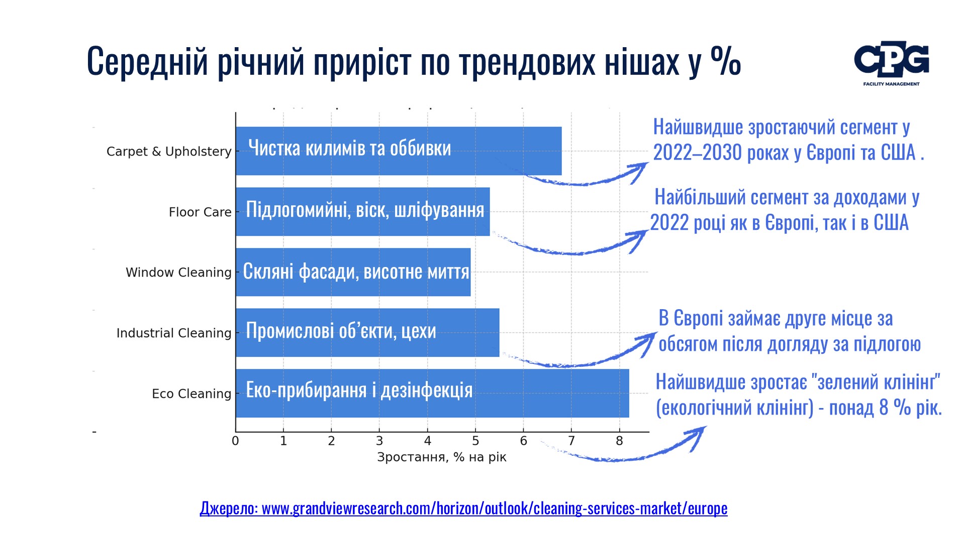 Эко-уборка и дезинфекция имеет наибольший прирост – более 8% в год. А самый большой сегмент по доходам в 2022 году как в Европе, так и в США – пойка полов, покрытие воском и шлифовка. Дело в том, что в США 90% полов – это бетон, который покрыт воском и каждое лето – бум заказов. Так же, как в Украине начинается весна и бум на мойку фасадов.