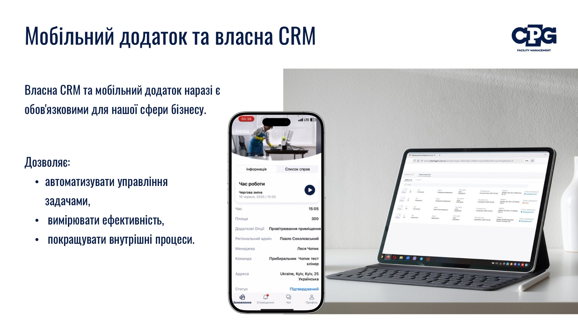 Cleaning Pro Group – один из лидеров рынка фасилити-менеджмента в Украине. Компания работает более 18 лет, предлагает полный комплекс услуг по управлению и эксплуатации недвижимости. По состоянию на начало июня имеет более 1833 точек в обслуживании, с 2022 года развивается в Польше, а с 2023-го – в США, в Хьюстоне.