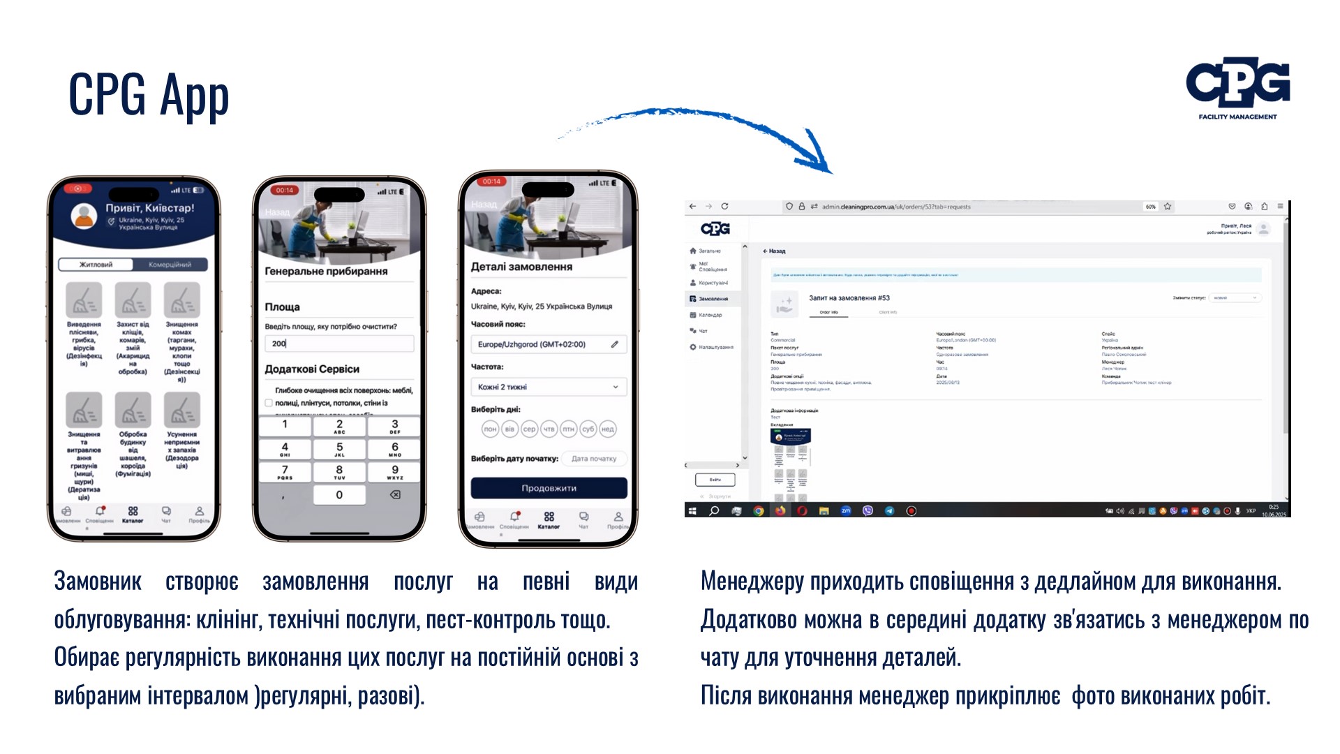Как это работает: заказчик создает заказы услуг на определенные виды обслуживания. Выбирает регулярность выполнения этих услуг на постоянной основе с выбранным интервалом, менеджеру приходит уведомление с дедлайном для выполнения. Можно также связаться с менеджером чата в приложении для уточнения деталей. После выполнения менеджер прикрепляет фото проделанных работ.