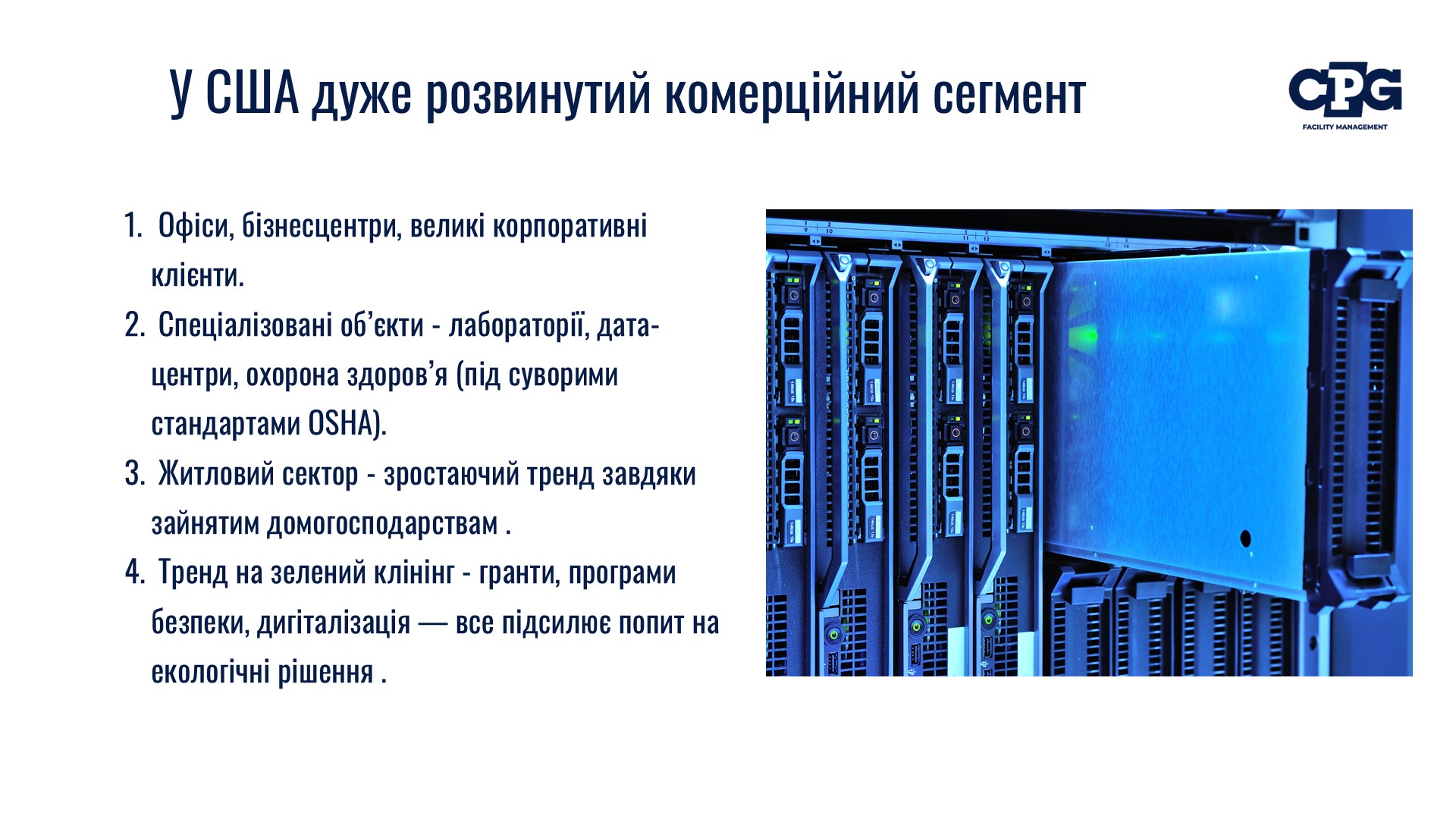 Рынок клининговых услуг в США имеет большую конкуренцию. В Хьюстоне около 2000 узкопрофильных компаний на население 8 млн человек. В Киеве 350-400 компаний на 3 млн населения. Можно сказать, что в столице Украины почти нет конкуренции.
