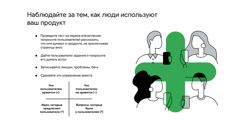 Можно, к примеру, запустить простой неформальный тест: попросить пользователей представить себя в какой-то ситуации и прокомментировать то, что они думают и делают. Нужно регистрировать основные моменты, чтобы потом обсудить их вместе с командой.