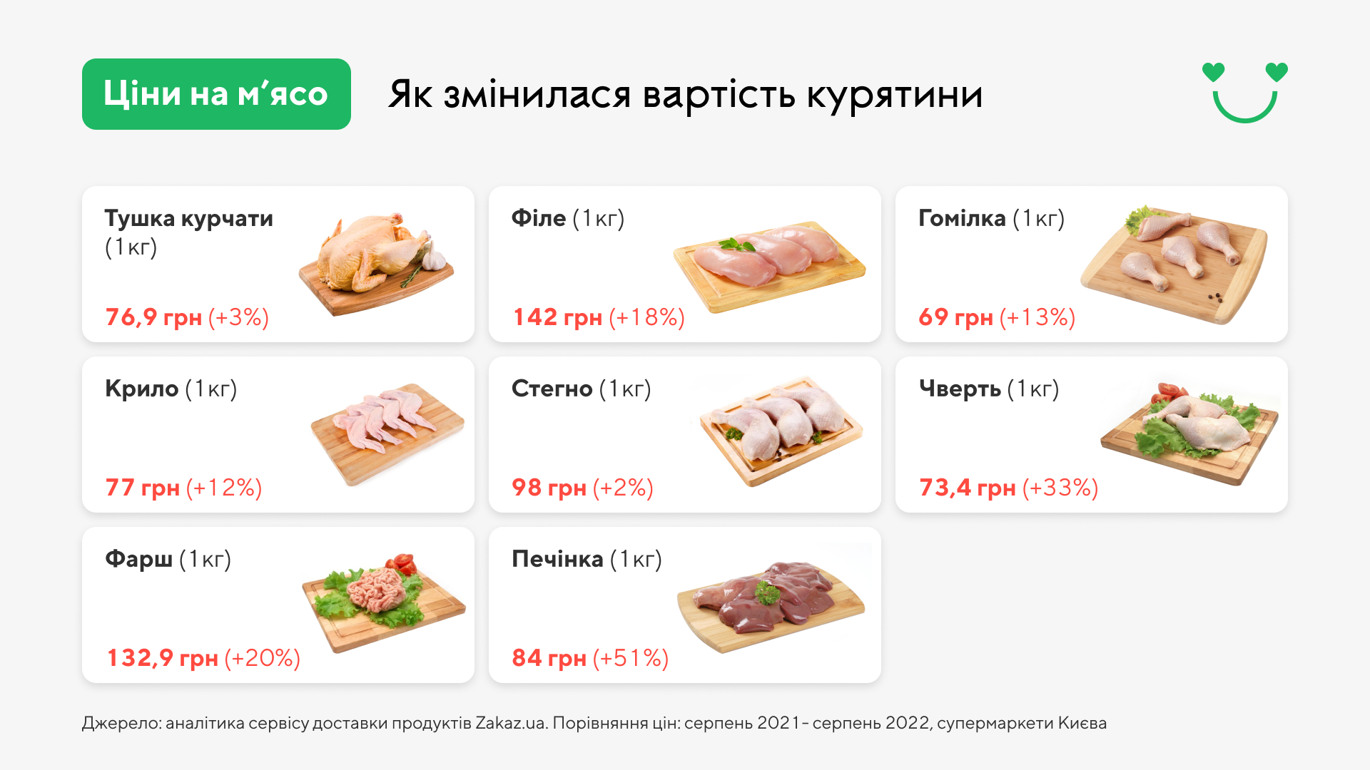 По наблюдениям Zakaz.ua, наибольшей популярностью среди украинцев пользуется курятина, встречающаяся в каждой третьей корзине онлайн-покупателя. Стоимость свежего куриного филе за год в украинских супермаркетах выросла на 18%. В августе 2021 года цена на полочках ритейлеров в среднем составляла 120 грн/кг, тогда как в этом году она подскочила до 142 грн/кг. Больше всего подорожала куриная печень – на 51%. Куриные голени в 2021 году в среднем стоили 60,8 грн/кг, сейчас – 69 грн/кг. Крылья стоят 77 грн/кг, что на 12% дороже прошлогодней цены. Кроме того, существенно возросла стоимость четверти курицы – до 73,4 грн/кг, что дороже на 33%. Купить фарш из курятины и приготовить котлеты сейчас обойдется дороже на 20%, чем за аналогичный период прошлого года.
