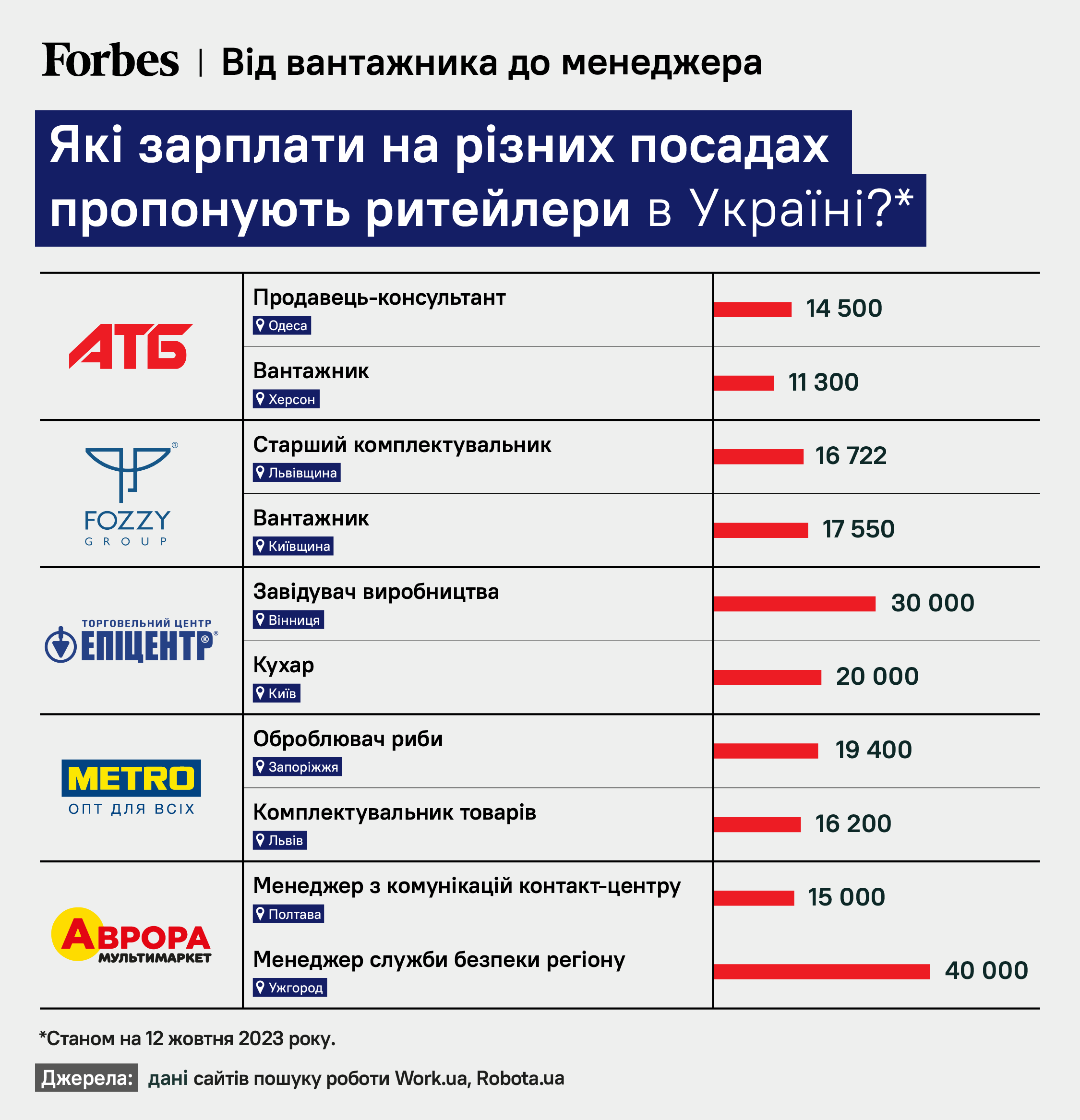 В целом по рынку ритейла оплата труда стала выше на 17% – выросла (по медиане) с 12 000 грн до 14 000 грн, говорит PR-директор сайта по поиску работы Work.ua Максим Пилипенко. Младшие специалисты с минимальным опытом стали получать зарплату на 20% больше, а управленцы – на 13%. Больше зарплата выросла в Ужгороде, Ивано-Франковске и Одессе.