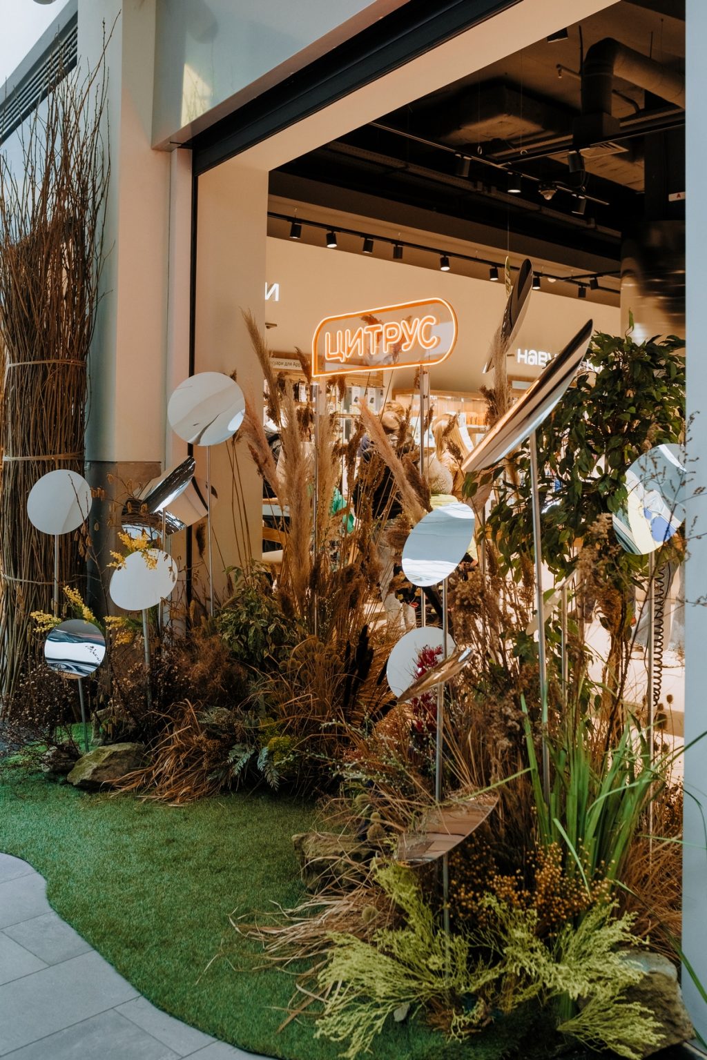 Рядом с самим магазином разместилась большая фотозона с цветами и сушеницами, возле которой можно было сделать фото. За отметку Цитрус на этих фото в Instagram разыгрывали одну из трех портативных колонок Divoom Mocha.