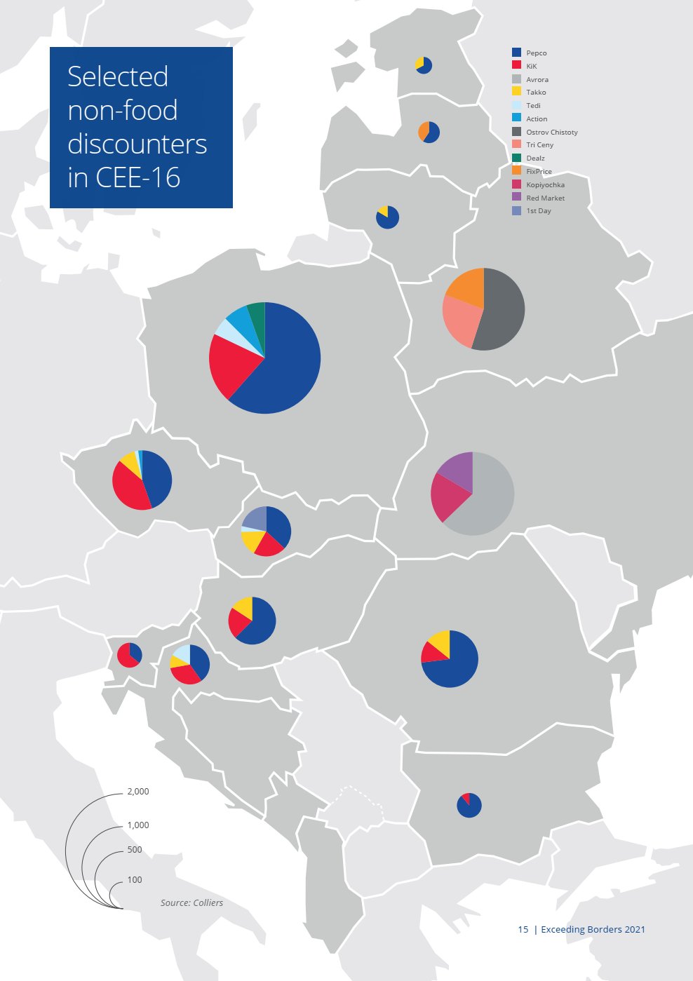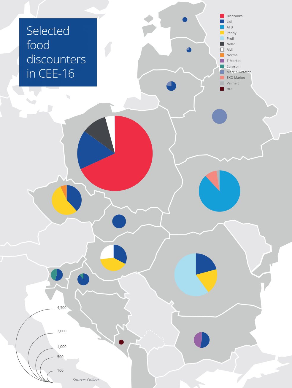 В регионе ЦВЕ насчитывается более 30 сетей продовольственных дискаунтеров. По количеству магазинов ведущим ритейлером является Biedronka, у которой есть более 3100 магазинов в Польше. Немецкая компания Schwarz Group, в которую входит Lidl, занимает второе место с более чем 2000 магазинов. Крупнейшая сеть продуктовых дискаунтеров в Украине – АТБ с сетью в более чем 1290 магазинов, занимает третье место. Кроме Lidl и Kaufland, другие немецкие сети развиваются в регионе ЦВЕ: Aldi представлена в Польше как Aldi Nord, а в Венгрии – как Aldi Süd; Penny представлена в Чешской Республике, Венгрии и Румынии. В период с начала 2020 года до конца первого полугодия 2021 года в Центральной и Восточной Европе было открыто более 1350 магазинов продовольственных дискаунтеров. В целом регион по-прежнему находится на пути развития.