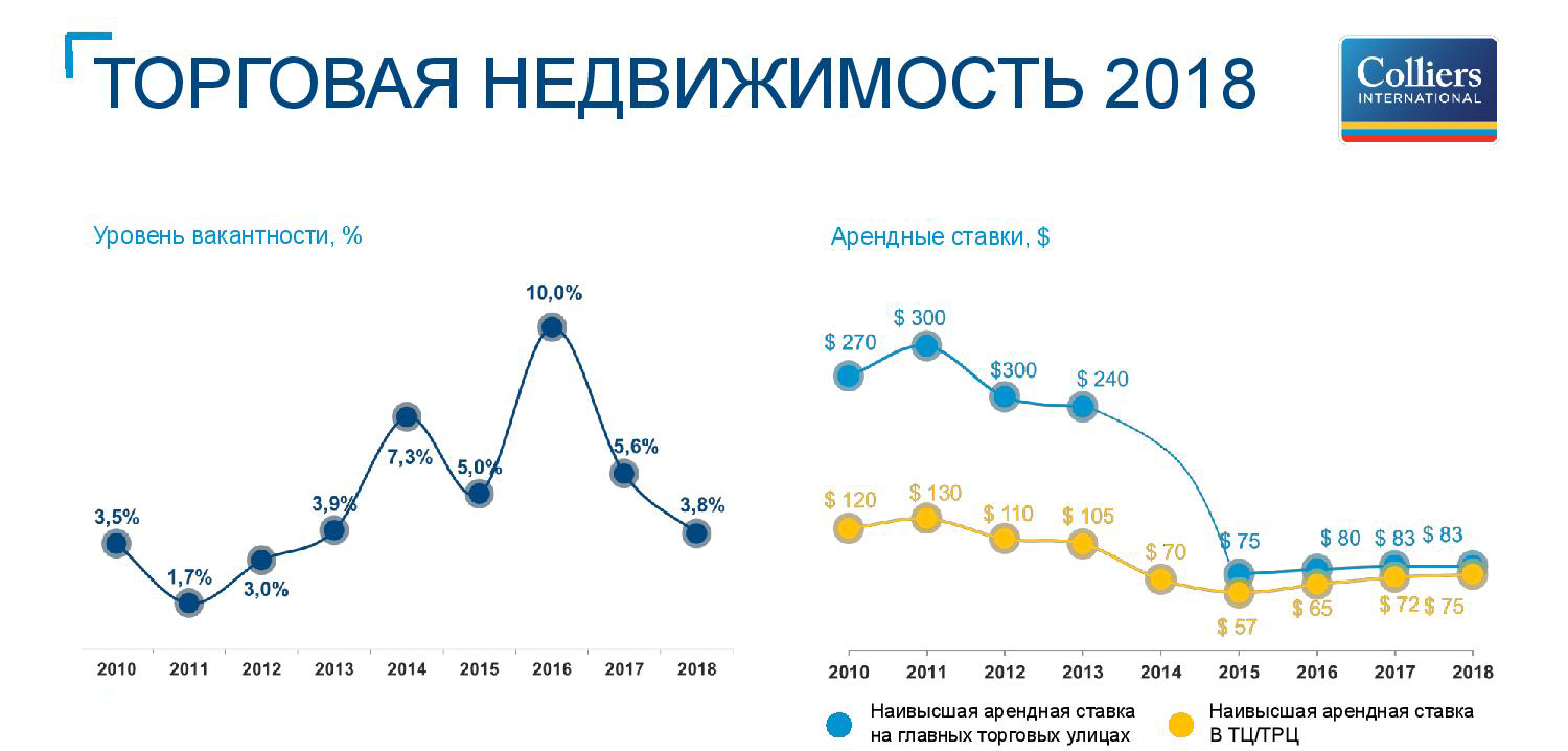 При этом вакантность снизилась на 1,8% по сравнению с показателем 2017 года, а арендные ставки в большинстве проектов показывали умеренный рост. На конец года наивысшие арендные ставки на секции 100-200 кв. м в наиболее успешных ТЦ/ТРЦ Киева составили $75 за квадратный метр в месяц.
