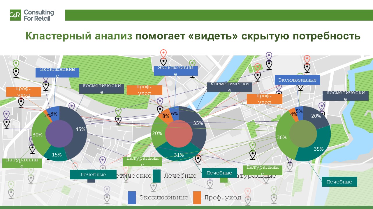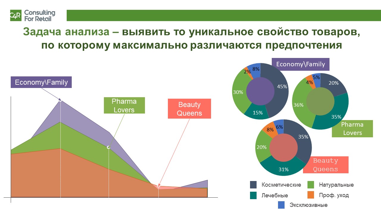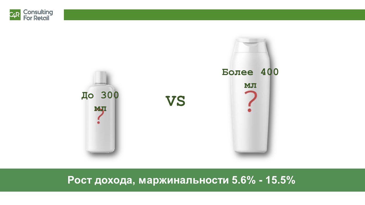 Часто категории требуют глубокого анализа свойств товаров, но иногда рычаг роста бывает простым и “лежит на поверхности”. Например, в одной из торговых сетей Восточной Европы выявили магазины, где спросом пользовались небольшие флаконы шампуня, во второй группе магазинов – предпочтения склонялись к более крупной расфасовке. При этом в обеих группах магазинов ассортимент и пропорции выкладки отличались незначительно.