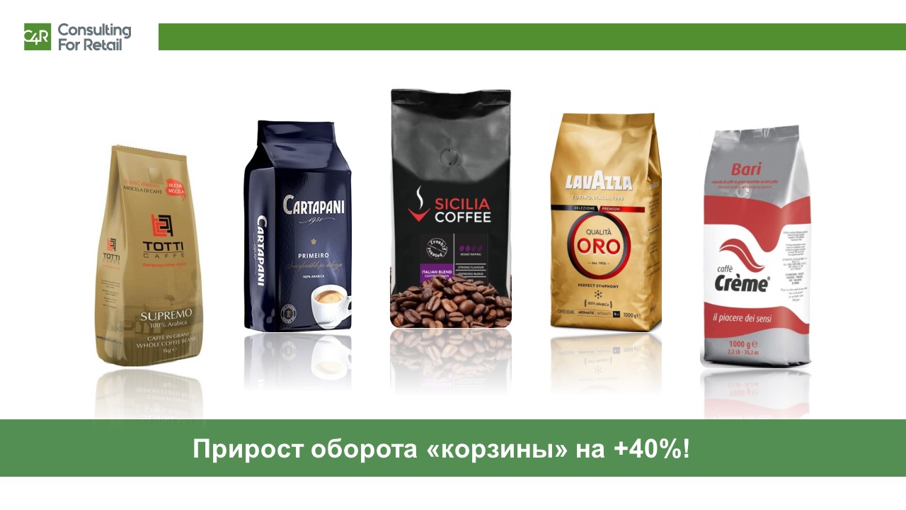Предположили, что это офис-менеджеры покупают кофе для рабочих коллективов. А объединяющий фактор, влияющий на выбор – псевдо-итальянское название. В связи с этим было предложено «прокачать» эту категорию, добавив 100% арабику из разных регионов и с разной степенью обжарки, поскольку в стране как раз случился рост культуры потребления кофе. Насыщение корзины зернового кофе за две недели увеличило продажи почти в полтора раза.