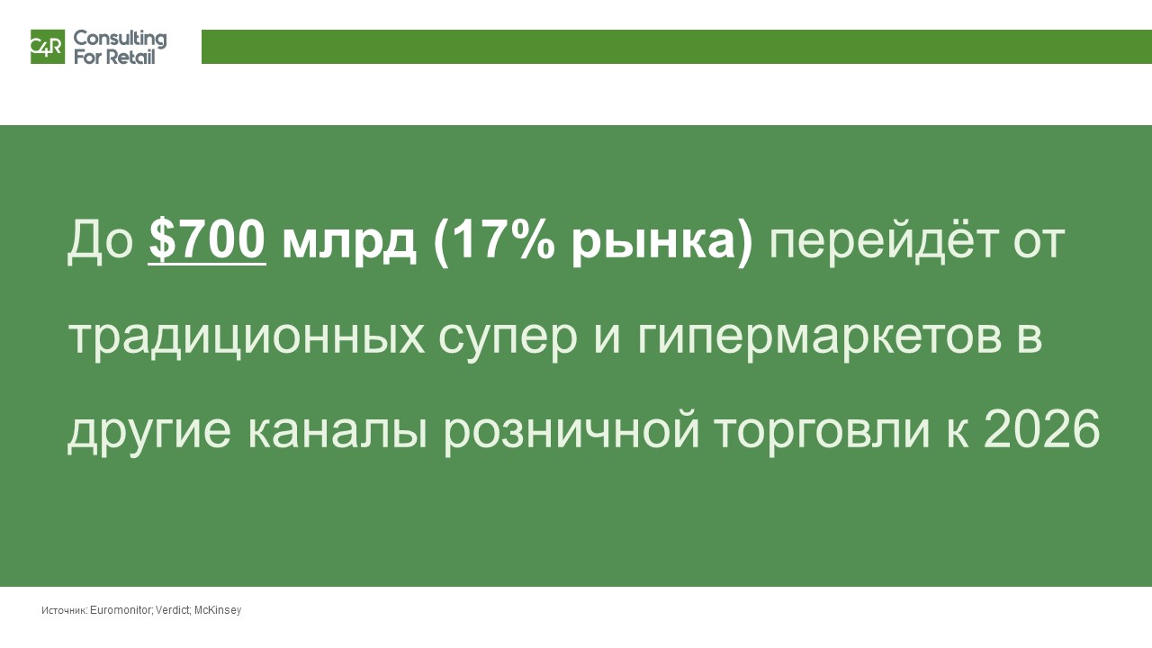 Изменения в современном ритейле ведут к тому, что игроки рынка вынуждены искать дополнительные возможности роста. Прогнозы мировых исследовательских компаний говорят о том, что к 2026 году до $700 млрд выручки или 17% рынка розничной торговли Европы и СНГ перетечет от традиционных гипермаркетов и супермаркетов в другие каналы розничной торговли – дискаунтеры, магазины у дома, специализированные магазины, и, конечно же, в электронную коммерцию.