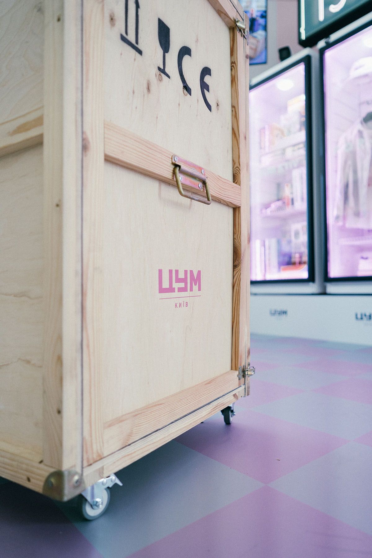 Pop-up ЦУМ оформлен в концепции summer market и размещен на четвертом этаже в зоне Кooperativ, возле летней террасы. В пяти стилизованных холодильных камерах представлен ассортимент easy buy products – fashion и non-fashion категории товаров, не требующие примерки. Приемы, реализованные в дизайне, дают отсылку к цветовой палитре ЦУМ и пересекаются с винтажной концепцией Кooperativ – розовый неон в холодильниках и напольное покрытие с паттерном кафельной плитки.