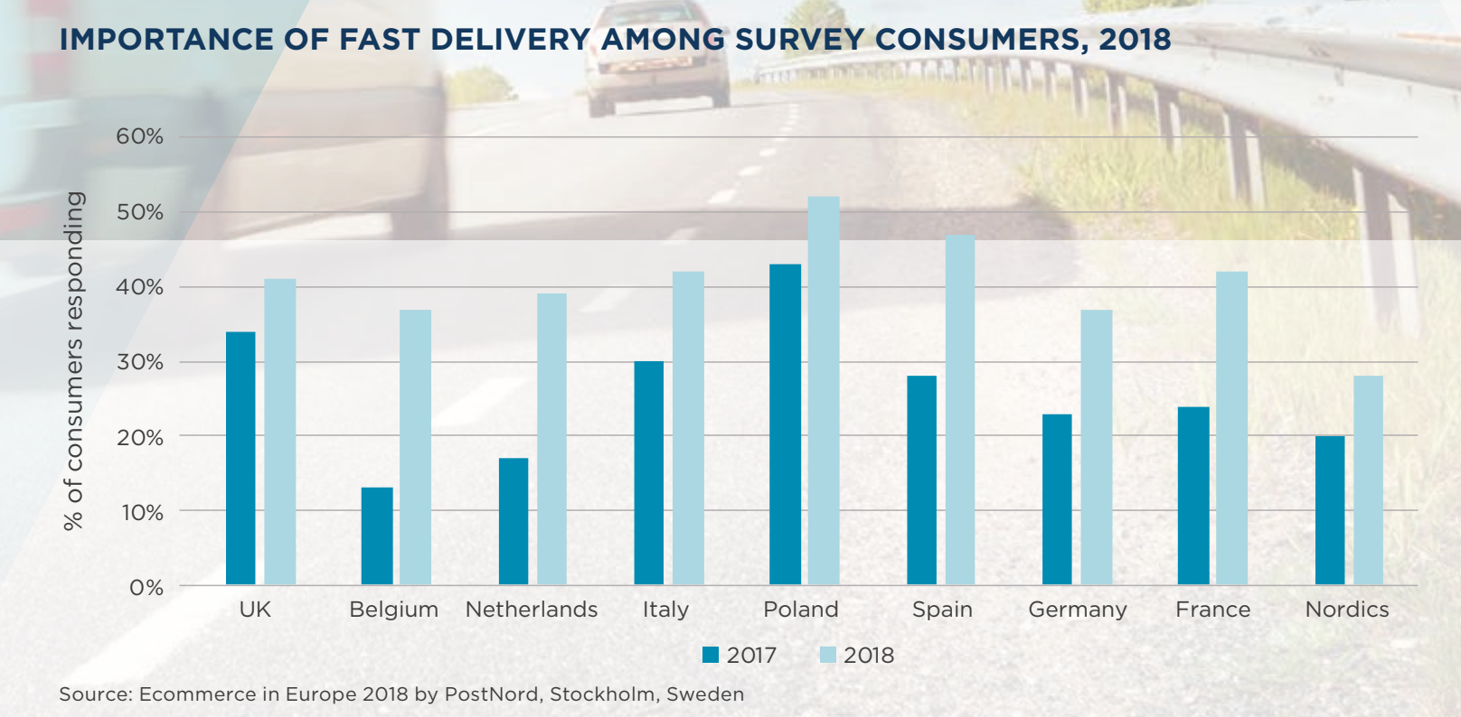 Опрос, проведенный в некоторых европейских странах в 2017 и 2018 годах, показал, что ожидания потребителей относительно скорости доставки растут.