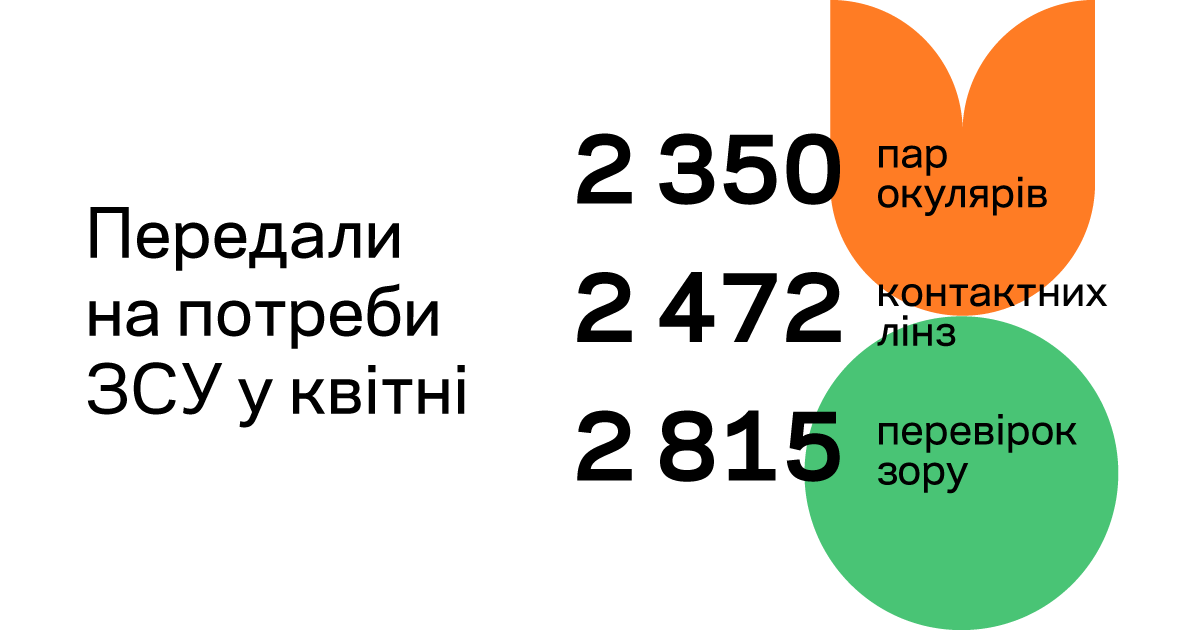 Кроме участия в других проектах и поддержки фондов, в рамках собственной социальной кампании «Добрые очки в добрые руки» в апреле Люксоптика передала на нужды ВСУ 2350 пар очков и 2472 контактных линз, а также провела 2815 проверок зрения военных. Почти в каждой оптике сети продолжается бесплатная диагностика зрения, обеспечение очками и контактными линзами для защитников и защитниц Украины с начала полномасштабной войны.