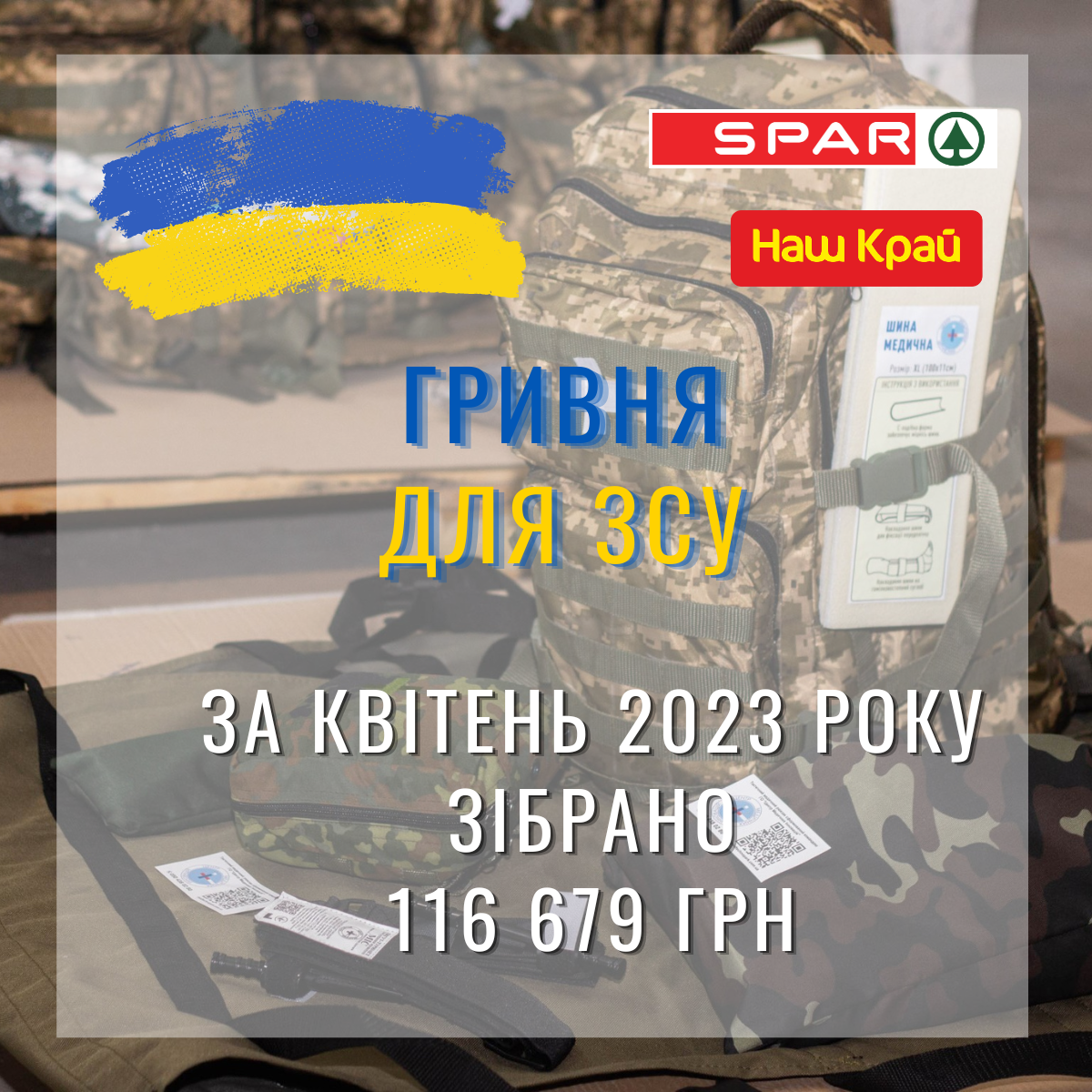 В 2022 году сети супермаркетов Наш Край и SPAR начали инициативу “Гривна для ВСУ”. Гостям магазинов предлагают добавить любую сумму к своему чеку на помощь защитникам и защитницам. Все средства идут на укомплектование медицинских аптечек, бесплатно передаваемых ВСУ. За апрель было собрано 116 679 грн. За весь период – более 1,3 млн. грн. Инициатива продолжается.