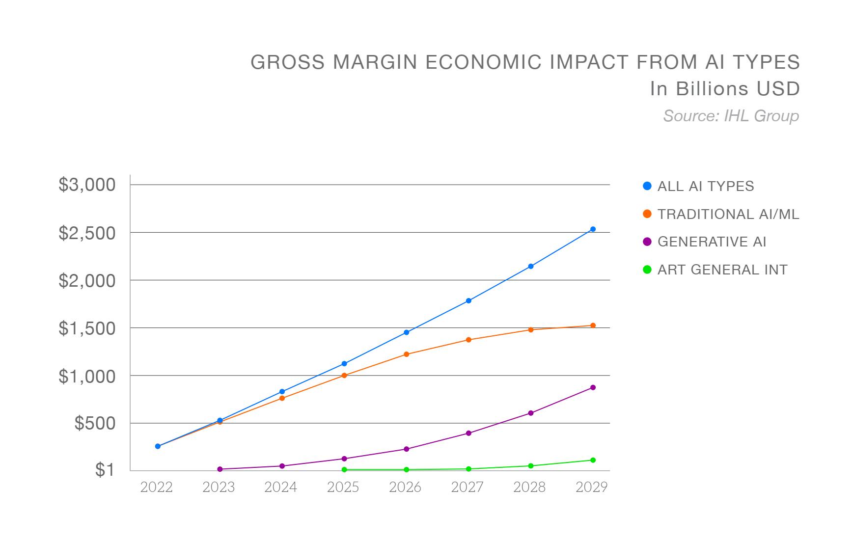 Эксперты IHL прогнозируют, что к 2029 году ритейлеры смогут увеличить свою нынешнюю валовую прибыль на 25% и более, используя искусственный интеллект. Один из способов – это улучшенное прогнозирование спроса, потому что традиционные методы прогнозирования часто полагаются на исторические данные и ручной анализ, которые не застрахованы от ошибок и не могут фиксировать изменения в поведении клиентов в реальном времени. Вместо этого алгоритмы ИИ могут анализировать данные о продажах, тенденциях поведения клиентов, социальных сетях и внешних факторах, таких как погода и общественные события. Выявляя закономерности и корреляции, ИИ может генерировать более точные прогнозы спроса.