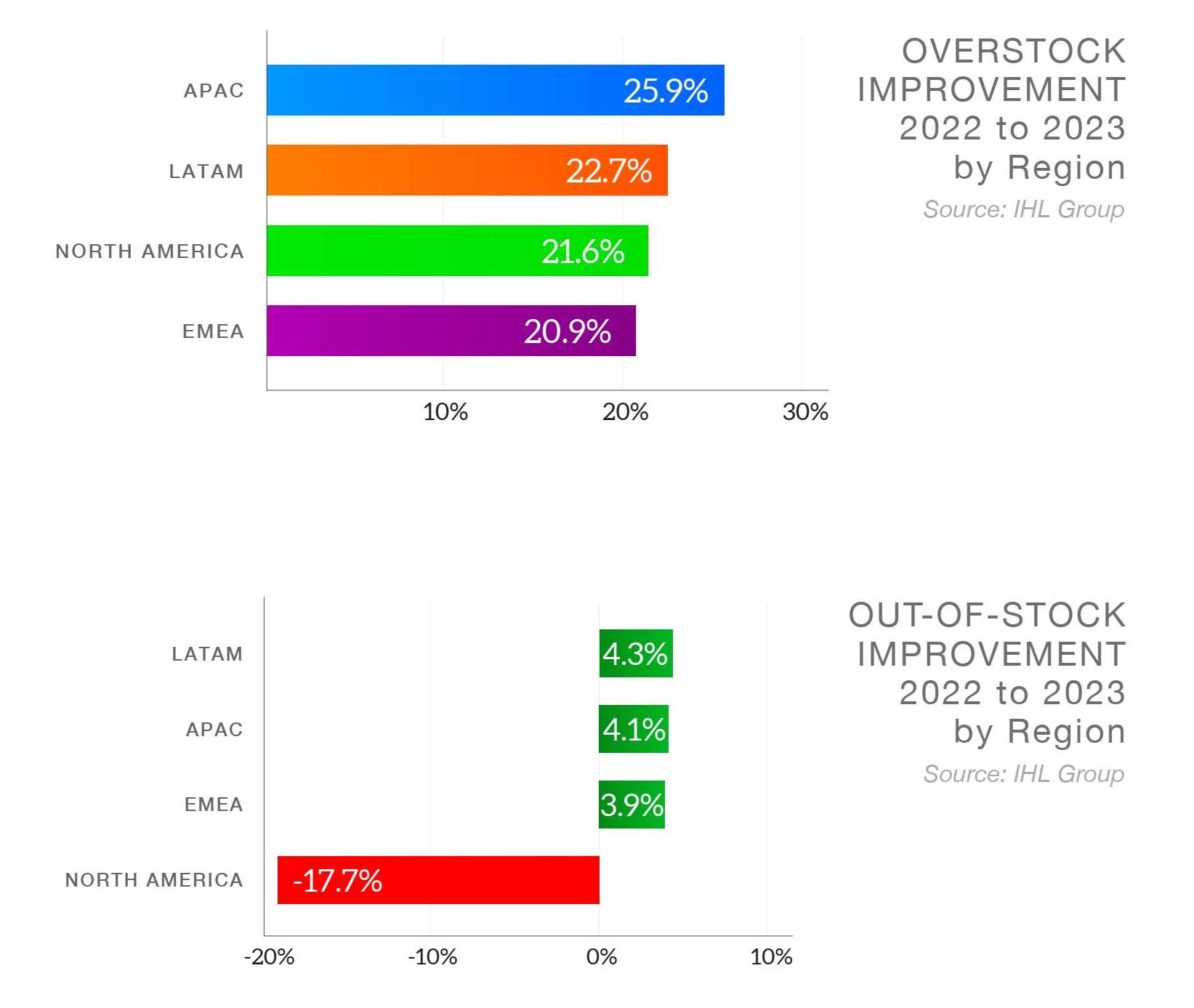 В странах Европы и в целом по региону EMEA, искажение товарных запасов уменьшилось на 10,0% по сравнению с 2022 годом. По мере того, как ритейлеры приспосабливались к новым реалиям демографического шока из-за миллионов беженцев из зон конфликтов, они начали нормализовать уровни запасов. Эти цифры также указывают на то, что инвестиции в IT-системы этих компаний дают положительный эффект.