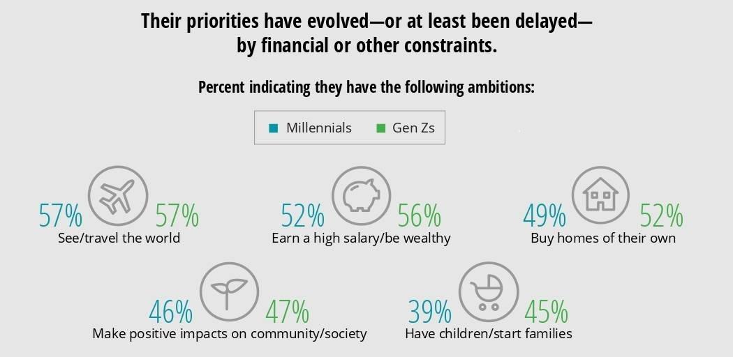 Приоритеты молодых поколений изменились. Теперь их главные стремления: путешествия, заработок и благополучие, недвижимость, польза обществу и, наконец, семья и дети.