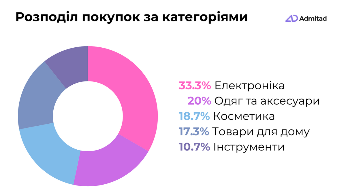 Согласно подсчетам Admitad, самыми популярными подарками стали электроника – бытовая техника, смартфоны и аксессуары – они составили 33,3% от всех покупок. Еще 20% украинцев выбирали для своих половинок одежду и аксессуары, а средства по уходу за собой и косметика вошли в 18,7% подарочных наборов. Домашние товары составили 17,3% общего количества покупок, а 10,7% украинцев выбрали инструменты и товары для ремонта. Многие украинцы не жалели средств — продажи цветов в три раза выросли в течение праздничной недели, а покупка ювелирных изделий и люксовых аксессуаров удвоилась.
