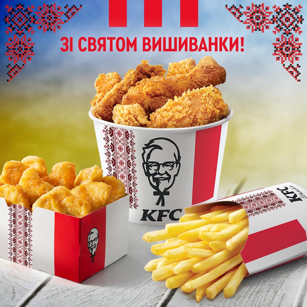 В KFC по случаю праздника в национальный орнамент “нарядили” фирменную упаковку. “Если бы курочка KFC могла менять свои наряды, то сегодня она бы выглядела именно так. С днем вышиванки, друзья! У каждого региона свои орнаменты, цвета и обычаи… Но вышиванка объединяет украинцев с востока на запад, от севера до юга. Сегодня мы все вместе в вышиванках, такие особенные и единственные”, – написали в компании и уточнили, хотят ли пользователи видеть упаковку курочки KFC в украинском орнаменте.