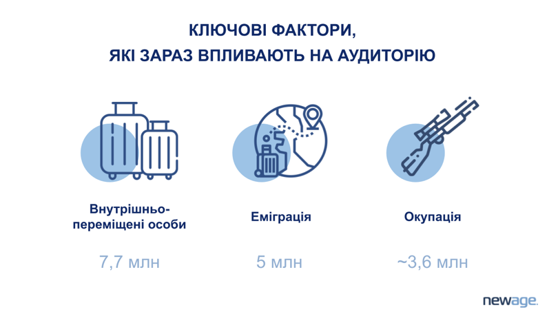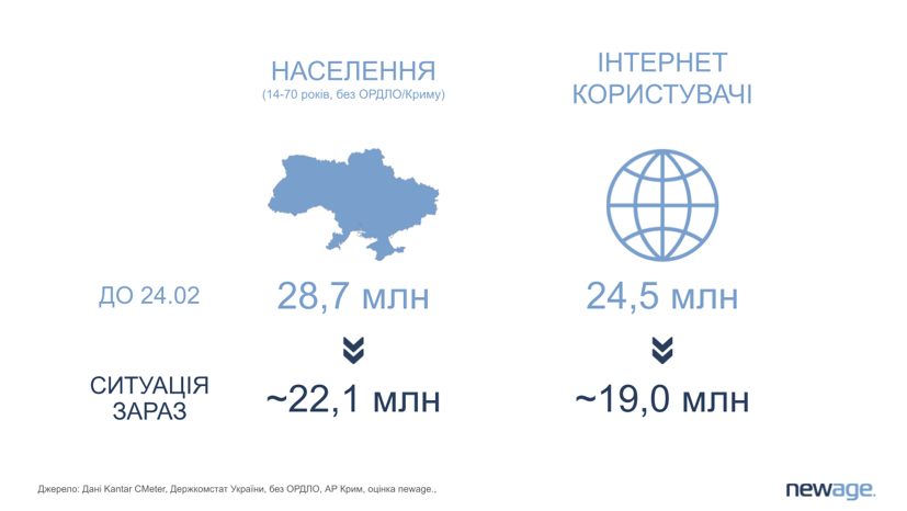 MarTech-агентство newage подготовило ежегодное исследование интернет-трендов Украины. Первое, что исследовали в newage — общая аудитория интернет-пользователей в Украине. Чтобы высчитать их количество, агентство обработало информацию о количестве покинувших Украину людей, а также высчитали количество людей, оказавшихся в оккупации. Агрегировав все данные, исследователи зафиксировали, что на май-июнь в Украине на неоккупированной территории находится ~22,1 млн. граждан в возрасте 14-70 лет, из которых около 19 млн. пользуются интернетом.