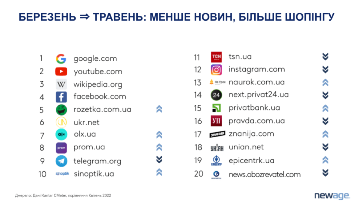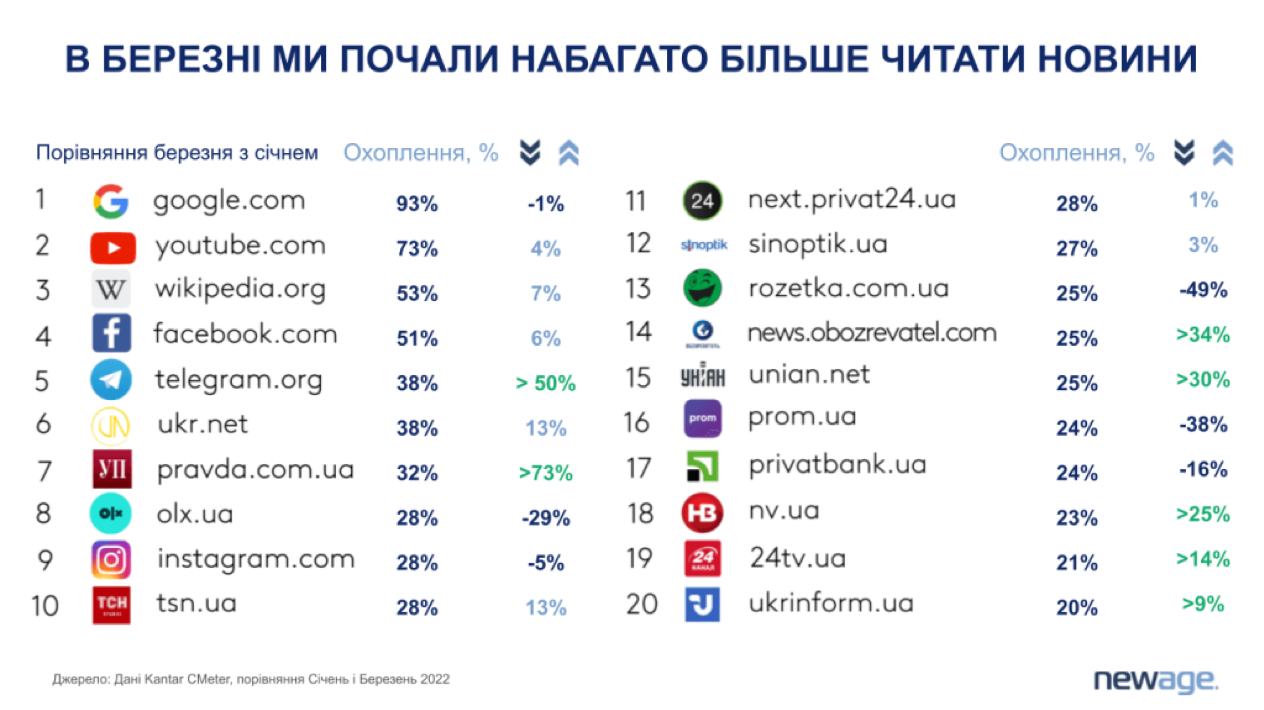 Значительная часть исследования посвящена потреблению контента и digital-привычкам украинцев. Так, в марте пользователи начали читать больше новостей, из 20 самых популярных сайтов 7 — это общественно-политические СМИ, и еще два назовем условно новостными: Телеграмм и Youtube.