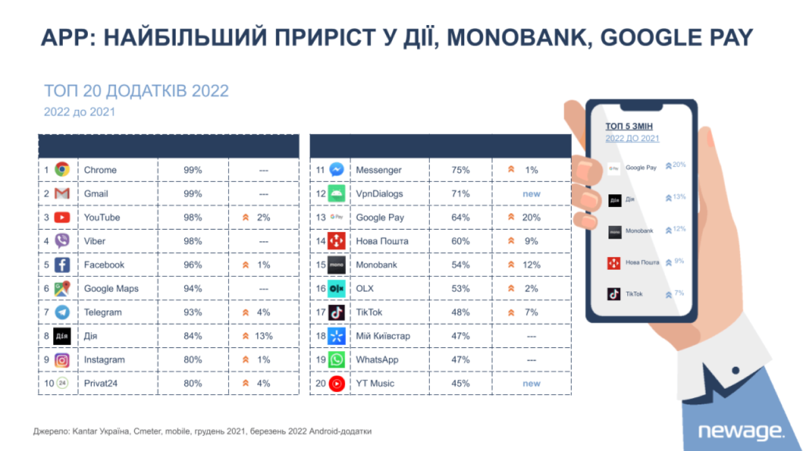 Также следует рассмотреть приложения, которыми пользовались украинцы с начала вторжения. На иллюстрации ниже представлено топ-20 приложений по установкам на android-устройствах со сравнением марта 2022-го по декабрь 2021-го. В топе четыре новых приложения, которых не было в исследовании-2021: VpnDialogs, Google Pay, YT Music и TikTok. Выбыли из списка самых популярных Shazam, AliExpress, My Vodafone и Rozetka.