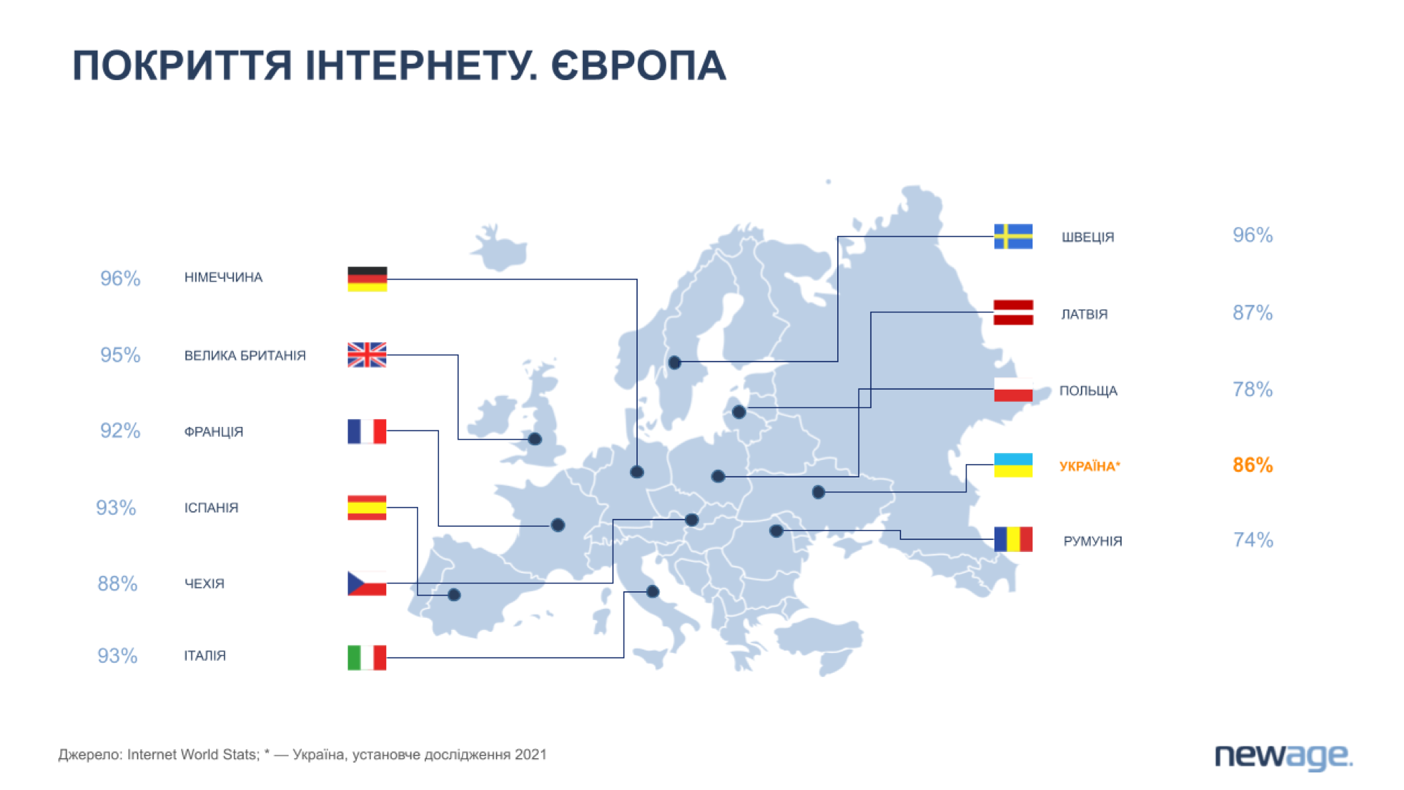 Если же говорить о глобальных трендах, имеющихся в украинском digital до февраля, то уровень интернет-покрытия в Украине на уровне других стран Восточной Европы – 86% (в прошлом году было 82%).