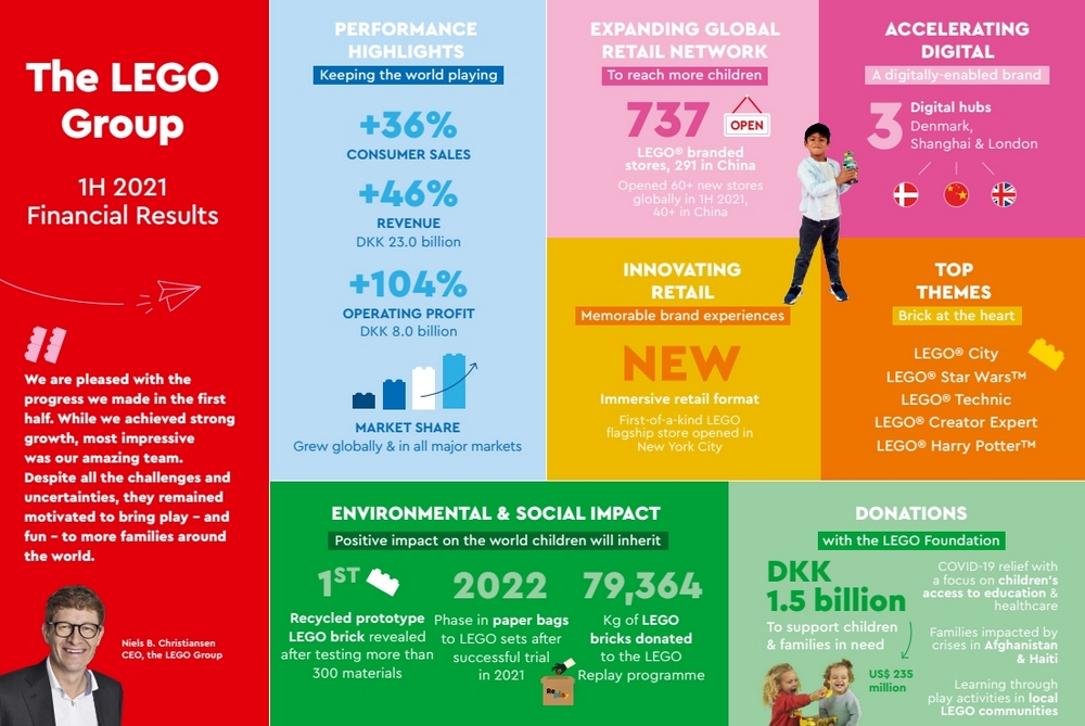 LEGO Group сообщила о своих финансовых результатах за I-е полугодие – до 30 июня 2021 года. Доходы за этот период выросли на 46% по сравнению с аналогичным периодом предыдущего года и достигли 23 млрд датских крон. Продажи потребителям выросли на 36%, что превышает соответствующие показатели игрушечной отрасли и обеспечивает рост доли как глобального рынка в целом, так и всех основных рынков.