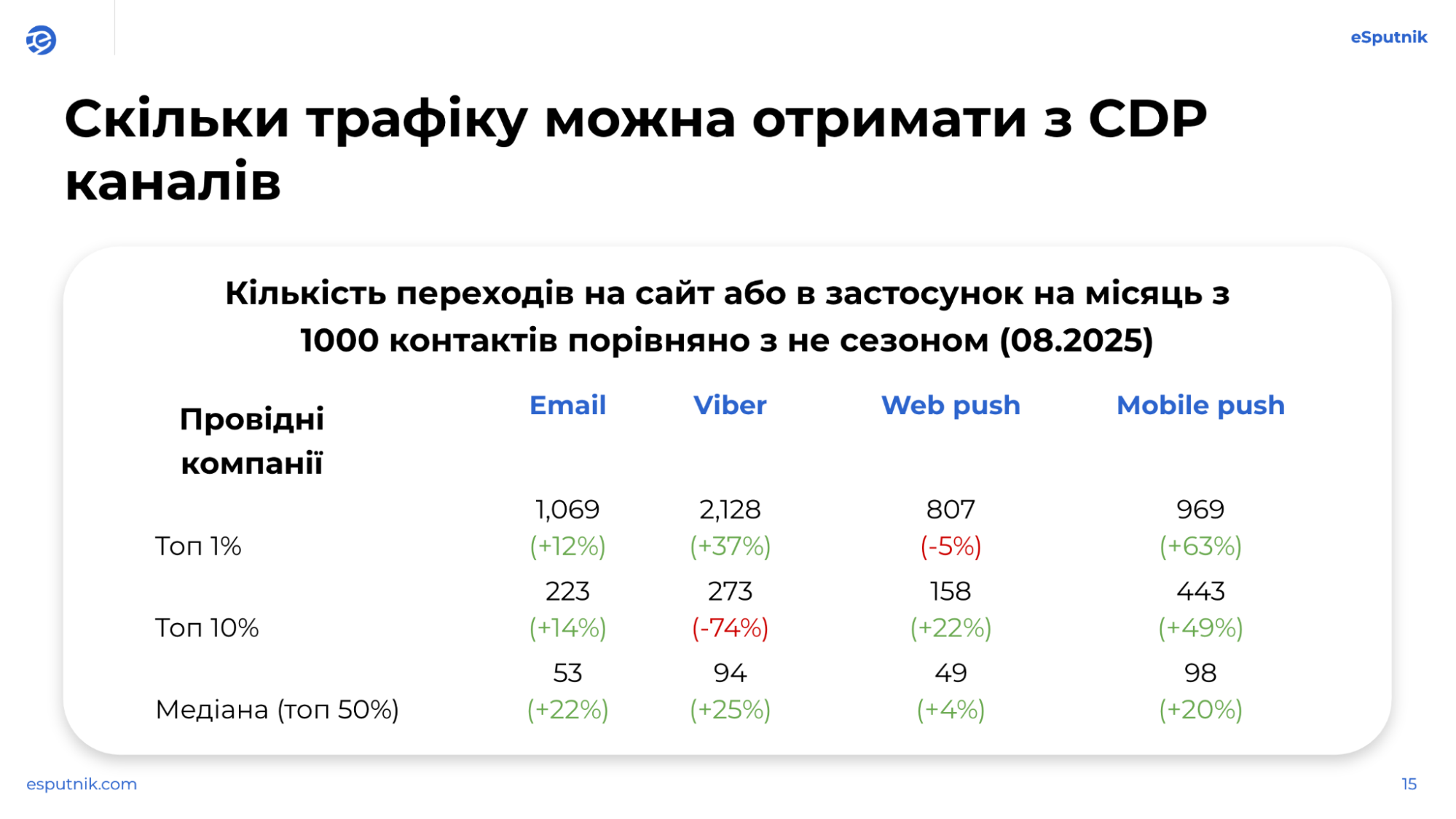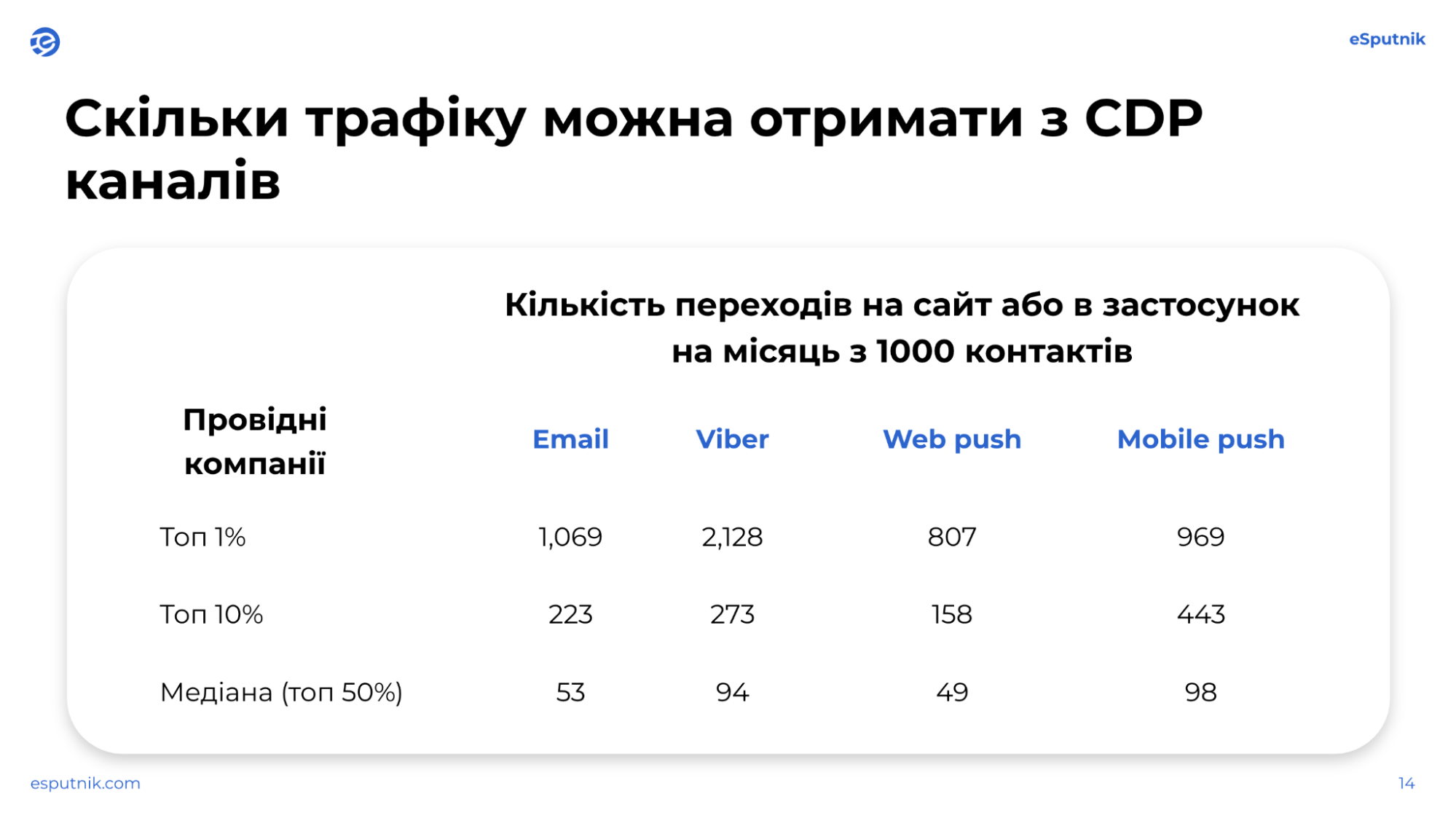 Команда eSputnik проанализировала объем трафика, который можно получить из разных каналов, с распределением по топ-1%, топ-10% и медиане (средний показатель).