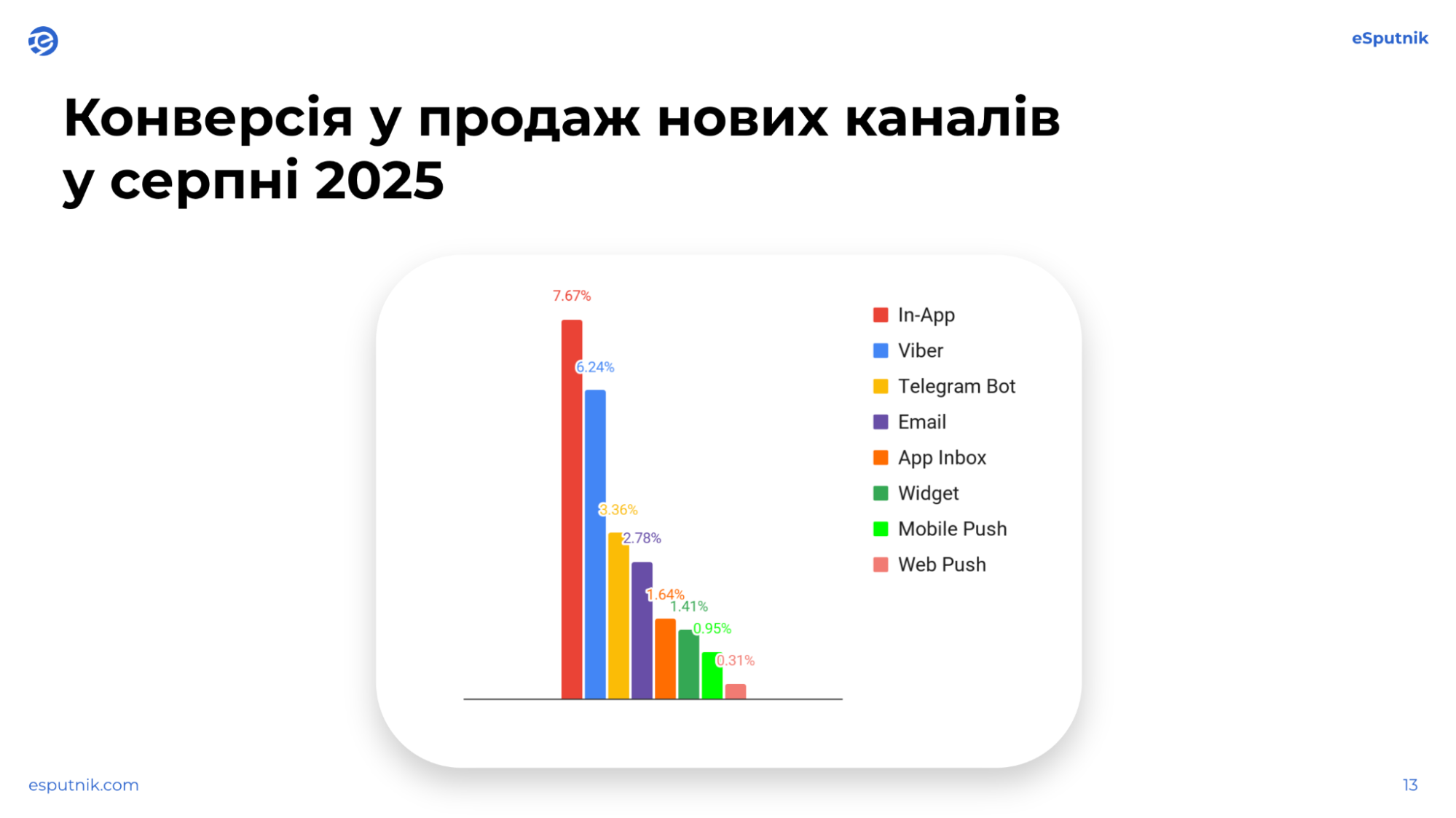 Канал SMS не может быть проанализирован по показателю CR, однако по другим метрикам его эффективность не хуже, чем у Viber. Поэтому его также рекомендуется использовать в маркетинговых кампаниях.