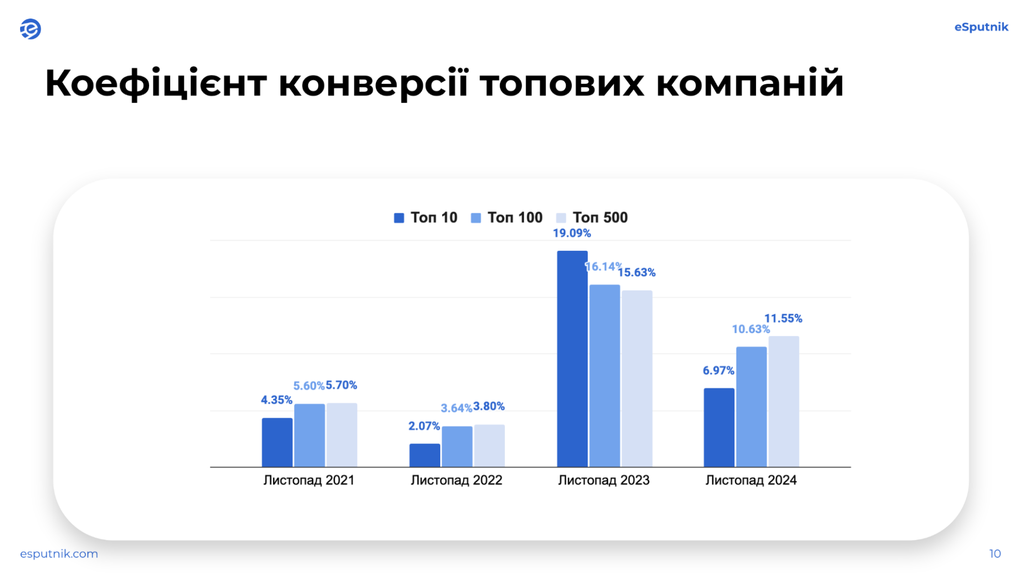 На графике конверсии разделены показатели для топ-10, топ-50 и топ-500 компаний (по показателю конверсии). Сравнение по годам демонстрирует значительные изменения в привлечении трафика, особенно в военные годы (2022, 2023, 2024). Они характеризуются аномальными показателями конверсии, что свидетельствует о волатильности рынка, в отличие от 2021 года. Показатели также существенно зависят от количества трафика в неделю Черной пятницы.
