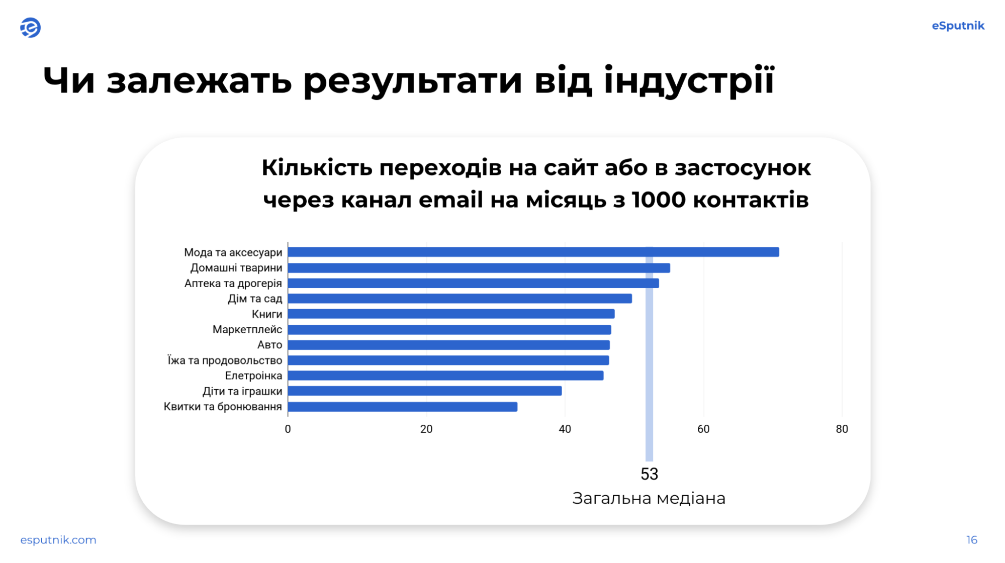 По количеству переходов на сайт или в приложение через канал email из 1000 контактов самые высокие показатели показывает категория «Мода и аксессуары». А общая медиана, на которую могут ориентироваться большинство бизнесов, — 53.