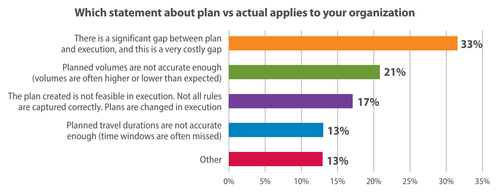 Как видим, между планом и исполнением существует значительный разрыв, и это очень дорогостоящий разрыв – отмечают 33% опрошенных. Для 21% запланированные объемы поставок оказываются часто выше или ниже ожидаемых. При этом 17% меняют свои планы по ходу выполнения. А еще 13% неверно планируют время доставки, часто «упуская» временные окна.