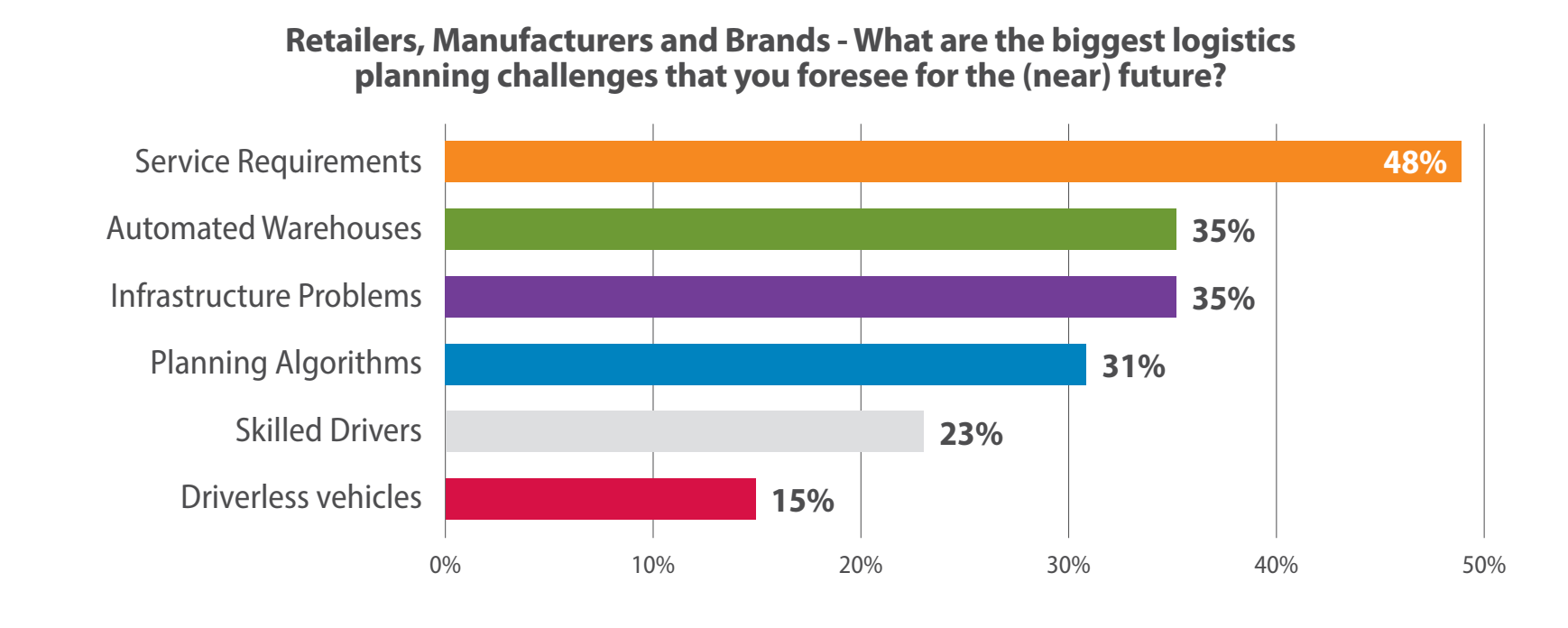 Производители, ритейлеры и отдельные бренды ожидают, что наиболее сильно на их бизнес повлияет рост требований к предлагаемому сервису (48%). А также модернизация инфраструктуры, автоматизация складов, потребность в опытных водителях, алгоритмах планирования и т.д.