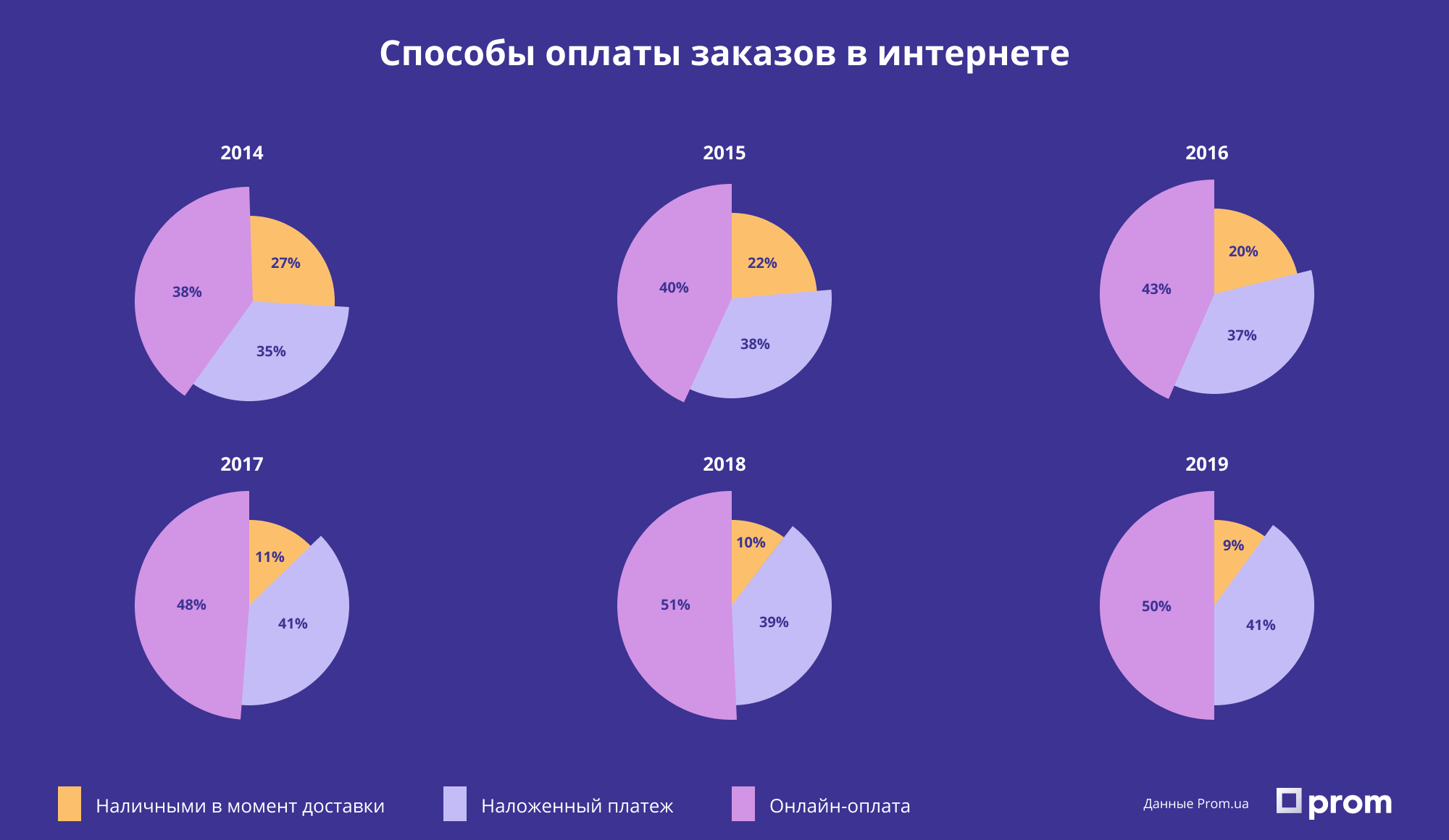 По данным Prom.ua количество онлайн-оплат покупок выросло с 38% в 2014 году до 50% в 2019-м.