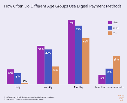 Безналичные способы оплаты наиболее популярны среди молодежи: 52% пользователей в возрасте 18-34 лет пользуются ими еженедельно. Однако и старшие поколения тоже активно используют онлайн-оплаты – 47% пользователей в возрасте 35-54 лет пользуются ими еженедельно, по сравнению с 24% пользователей в возрасте 55 лет и старше.