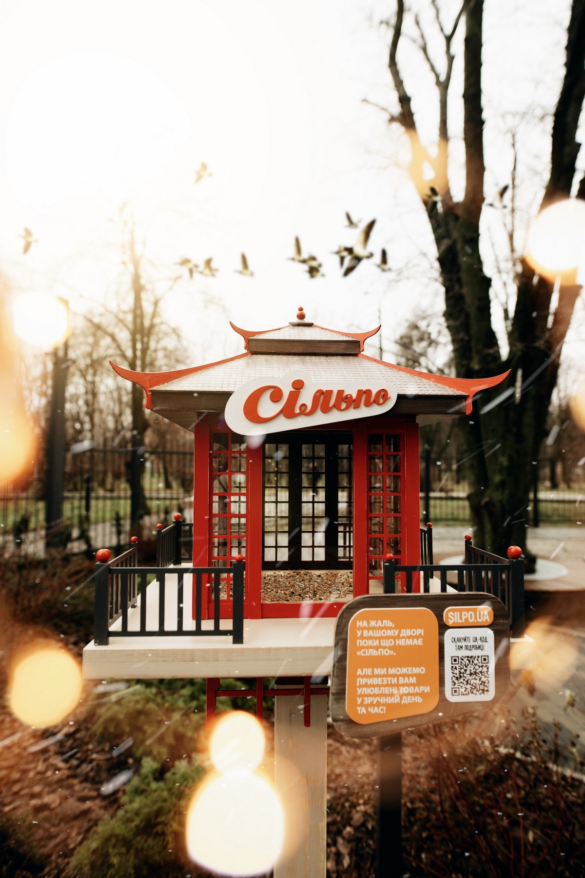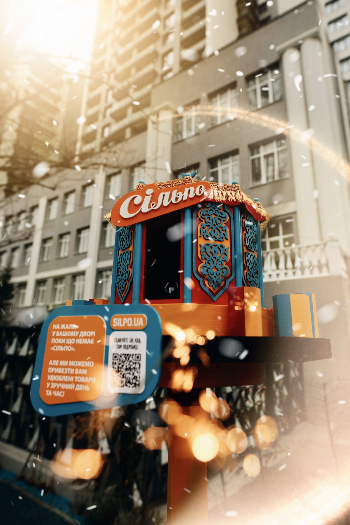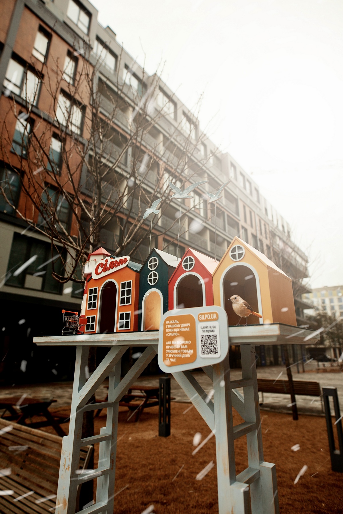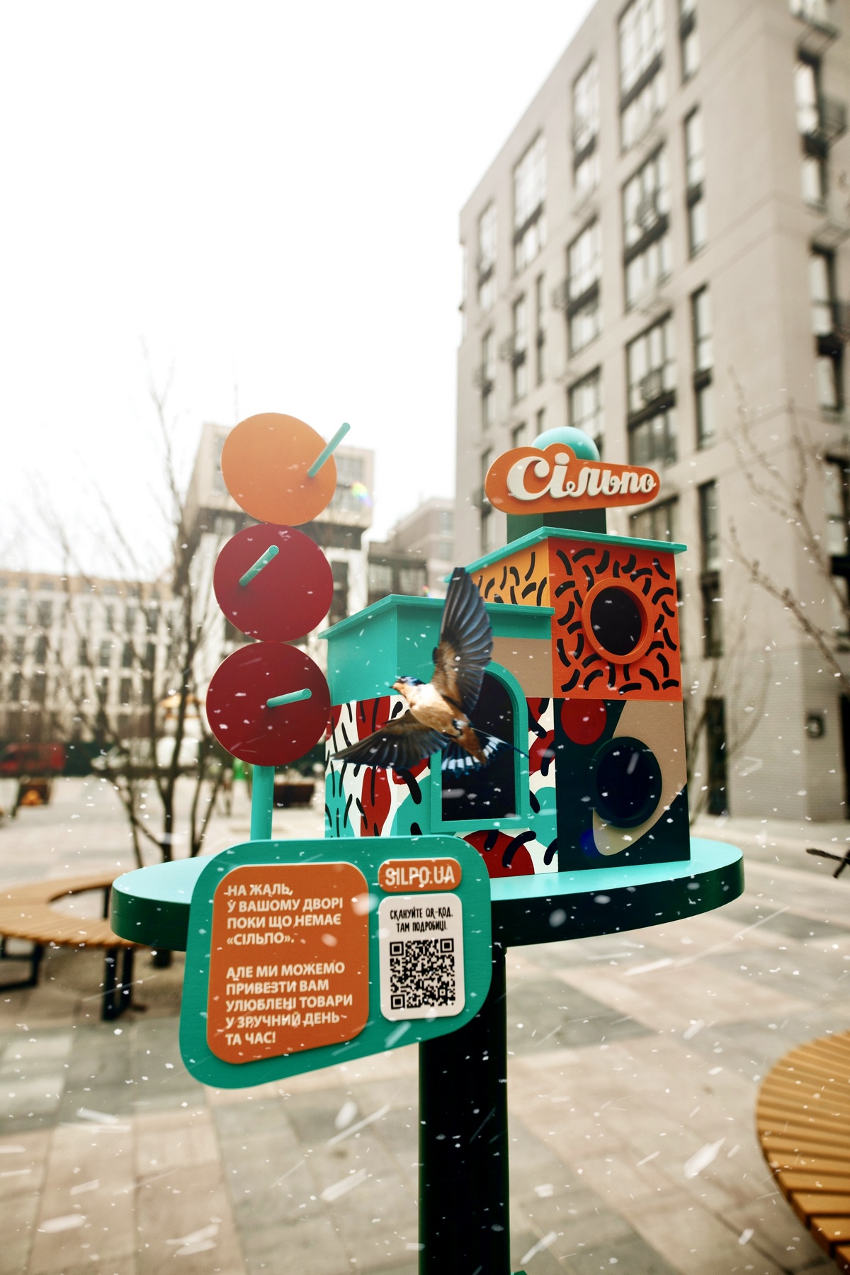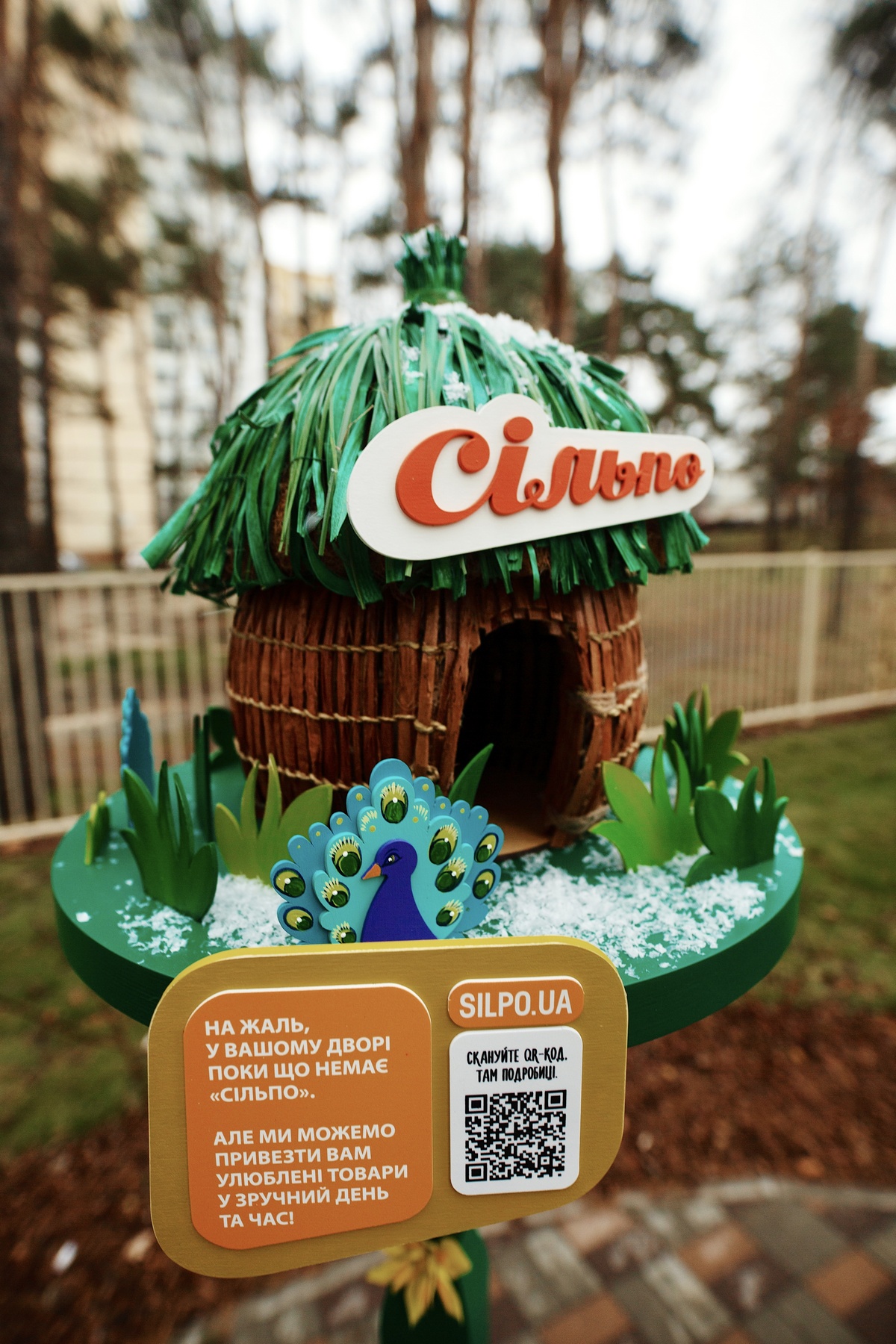 Первые пять кормушек для птиц в стиле существующих дизайнерских супермаркетов уже установлены возле киевских жилых комплексов, рядом с которыми нет Сільпо, но теперь есть возможность пройти по QR-коду и заказать доставку из интернет-магазина silpo.ua
