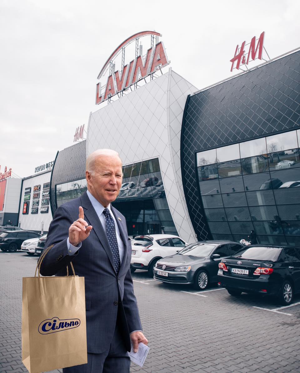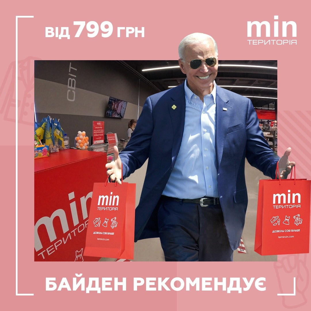 “Байден был замечен в шопинг-центре Территория минимальных цен. Подарил для вас промо-код -10% скидки по промо-коду “Biden”, в честь своего визита в Киев. Рекомендует прикупить классические пиджаки, говорит цена огонь – от 799 грн”, – написали в соцсетях Территории минимальных цен. Промо-код действует только на сайте с 20.02.23 по 28.02.23.