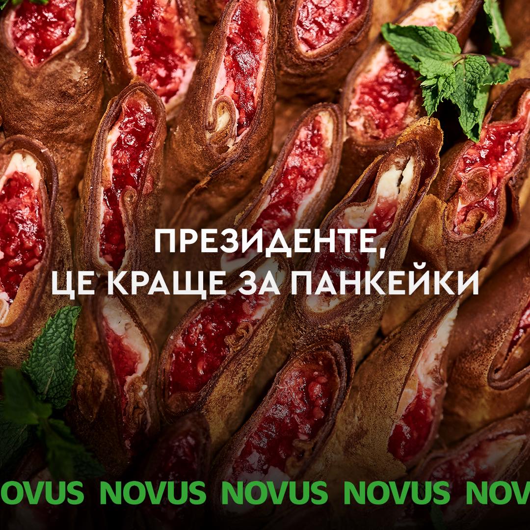 “Уважаемый господин американский Президент, видели вас на Михайловской площади, – написали Novus – Жаль, что вы не успели зайти в гости, ведь у Novus с сегодняшнего дня маркет блинов на все вкусы и цвета. Хорошо, сделаем исключение. Пишите адрес — курьер выезжает!”