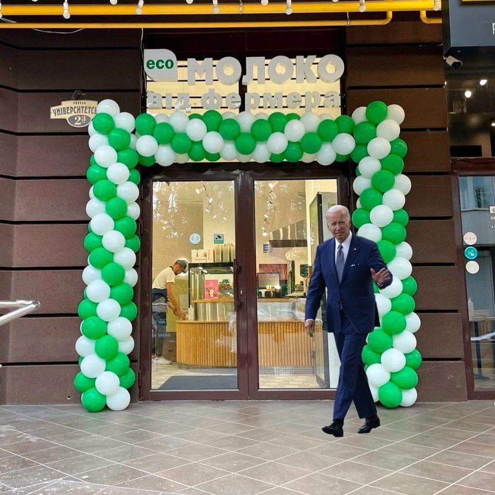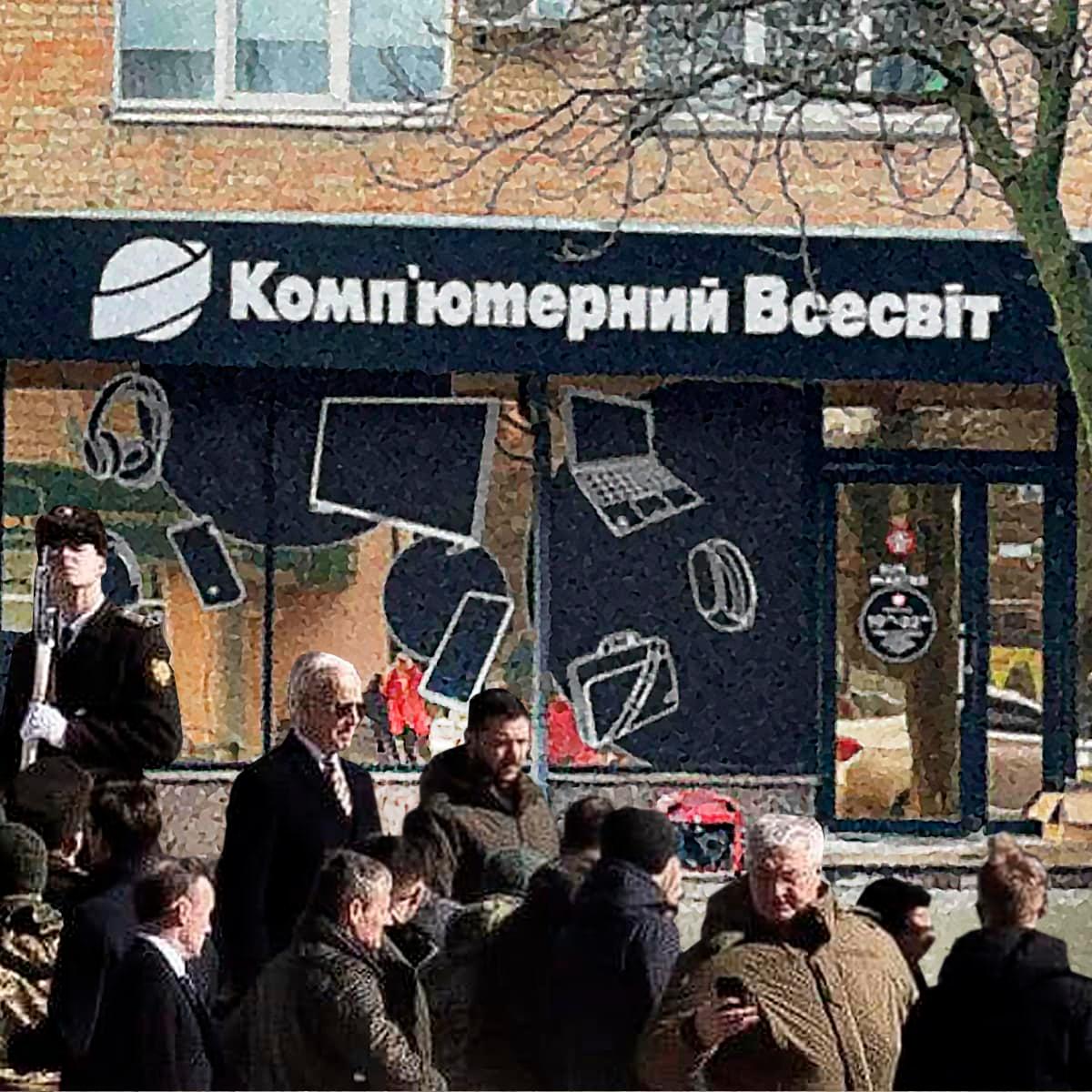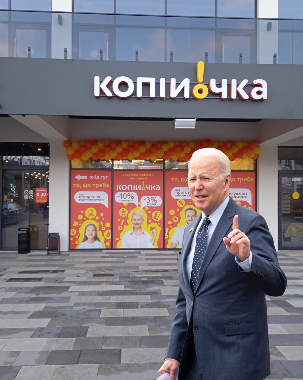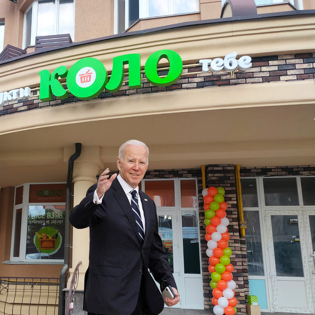 За время непродолжительного визита в Киев Президент США Джо Байден продемонстрировал настоящее мастерство в управлении временем и пространством. Почтенный гость успел не только встретиться с Владимиром Зеленским, почтить память погибших украинских воинов, оставить послание в гостевой книге Мариинского дворца и выступить в Верховной Раде, но и прогуляться по всему Киеву и не только. Конечно, если верить украинским ритейлерам.