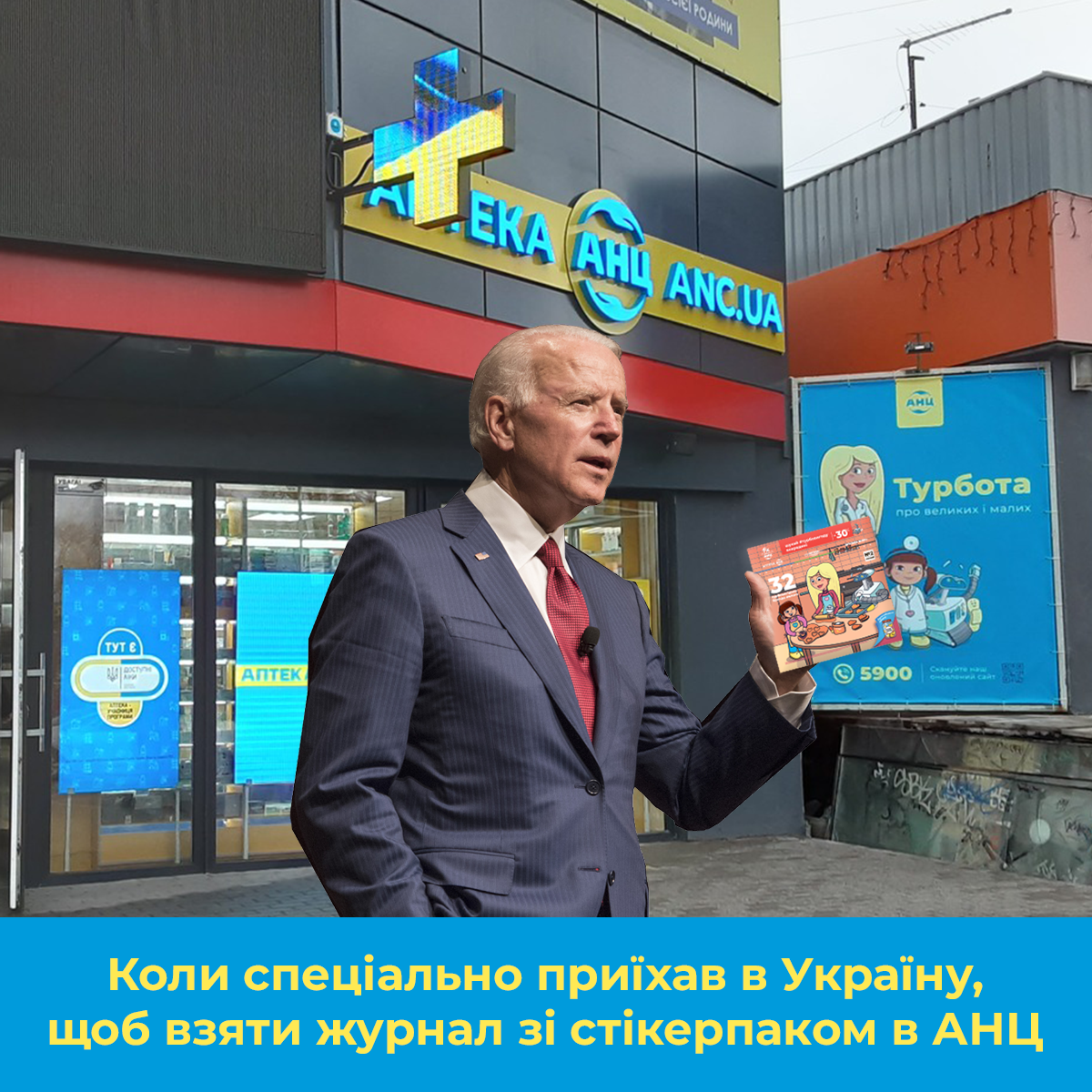 По версии сети Аптека АНЦ, Президент Соединенных Штатов специально приехал к ним по журналу со стикерпаками. “Понимаем Джо. Минус один экземпляр в аптеках. Торопитесь! Лучшего сувенира из Украины сложно придумать”, – написали в Facebook сети.