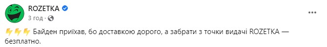 “Байден приехал, потому что доставкой дорого, а забрать с точки выдачи Rozetka — бесплатно”, – оставили краткий пост без изображений на Facebook маркетплейса.