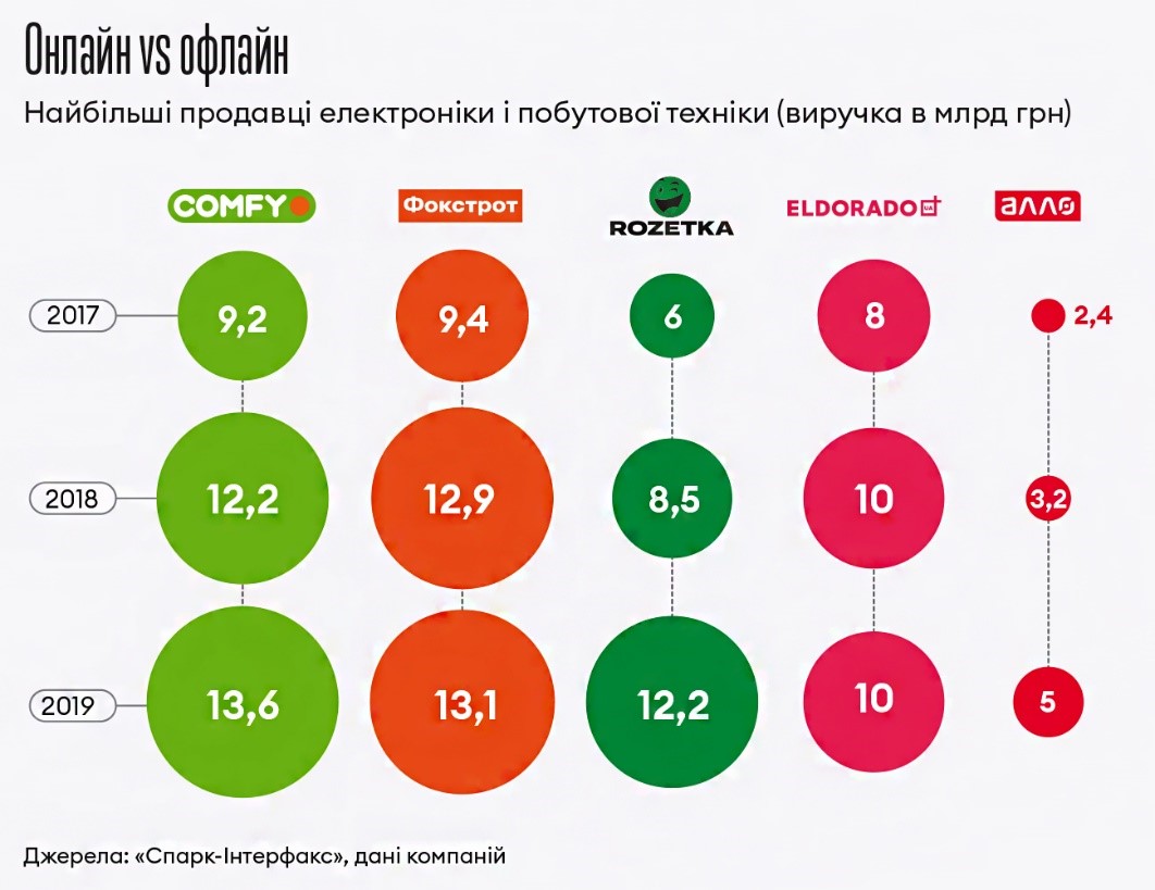 Выручка компании за 2019 год, по данным «СПАРК-Интерфакс», достигла 12,2 млрд грн. Наибольшая доля продаж приходится на бытовую технику и электронику. У конкурентов из офлайн финансовые показатели соотносятся. Выручка Comfy за 2019 год – 13,6 млрд грн, Фокстрот – 13,08 млрд грн, Eldorado – 9,6 млрд грн. Rozetka.ua при этом растет быстрее. С 2017 года выручка компании удвоилась, а чистая прибыль увеличилась почти в 4,2 раза. Выручка Comfy, Фокстрот и Eldorado выросла за тот же период примерно на 50% у каждого.
